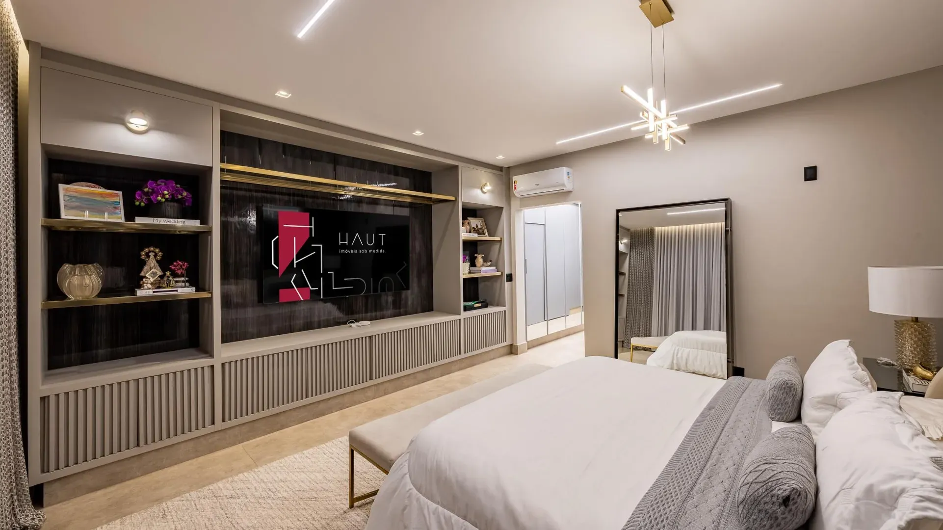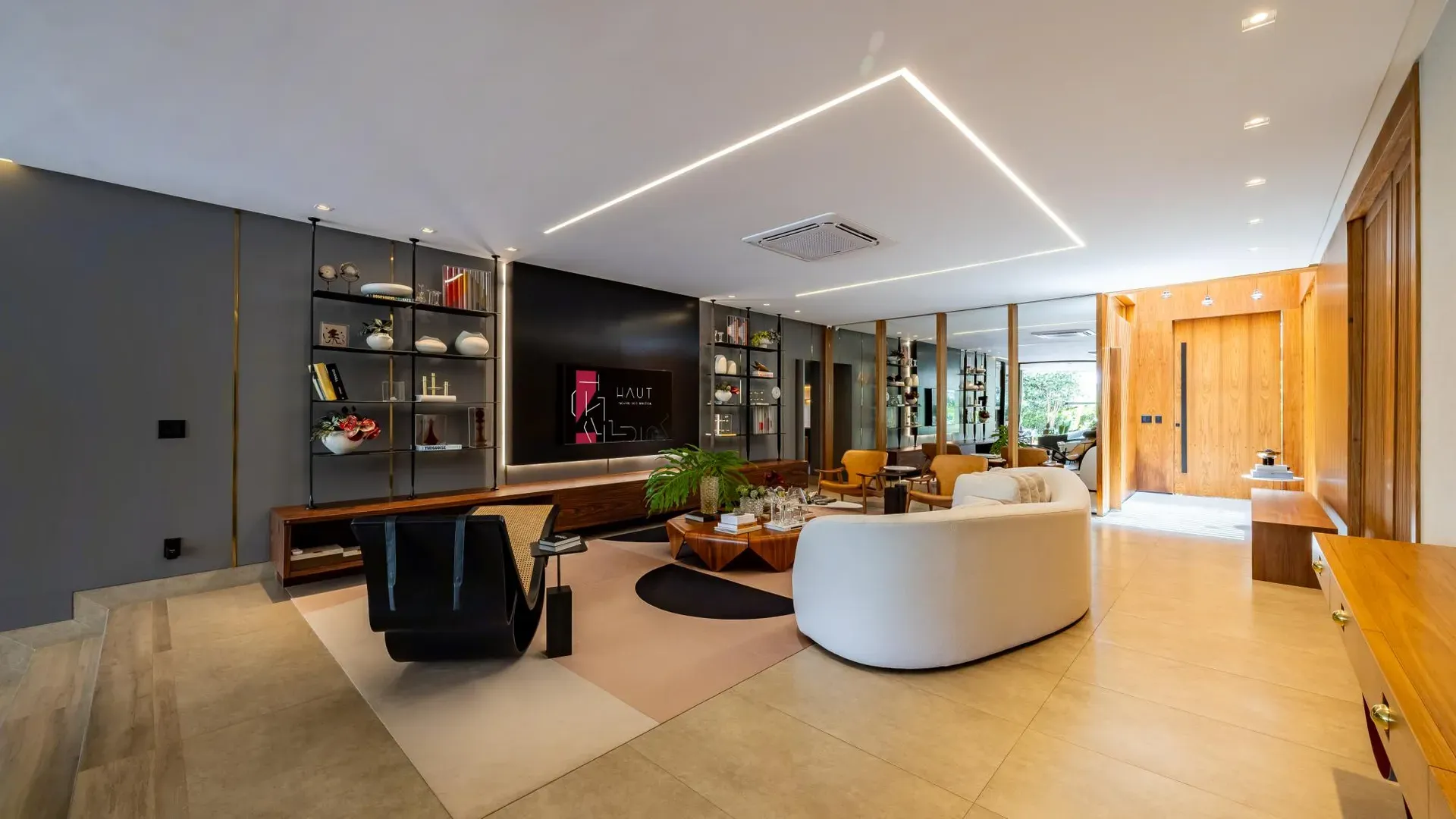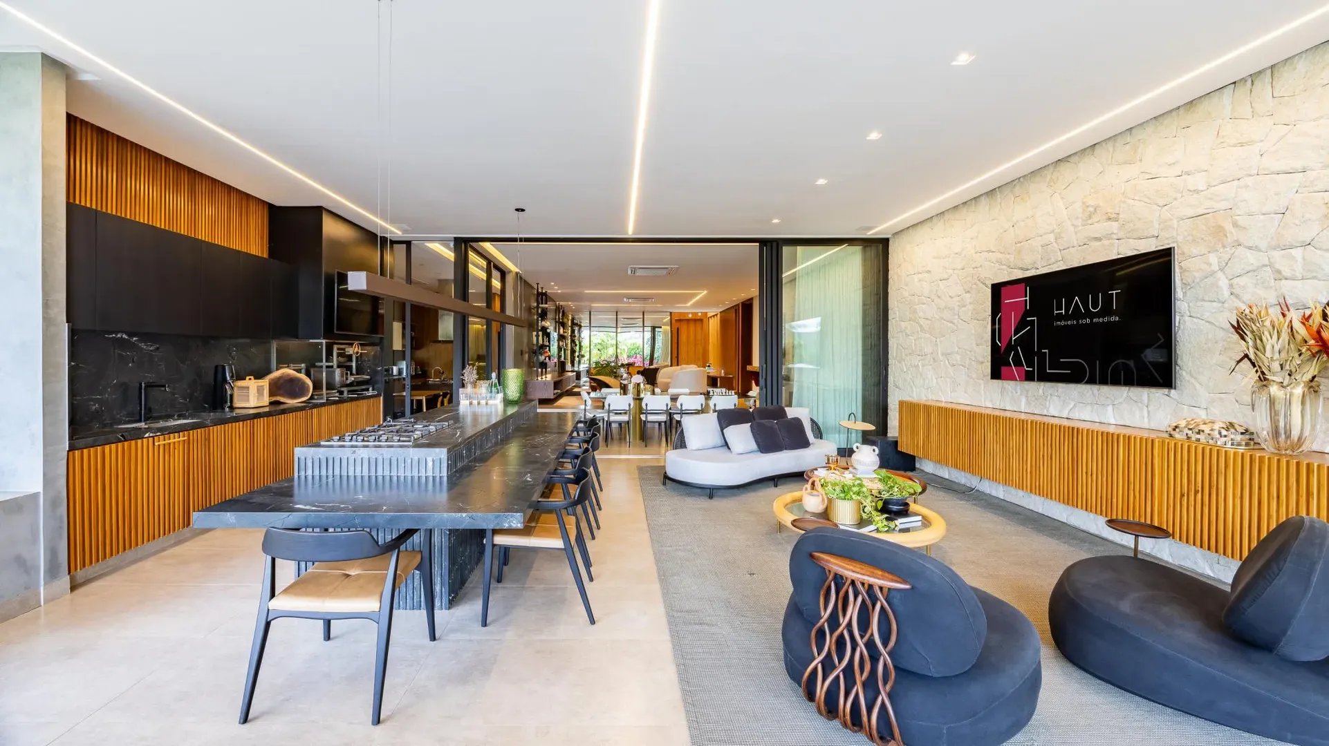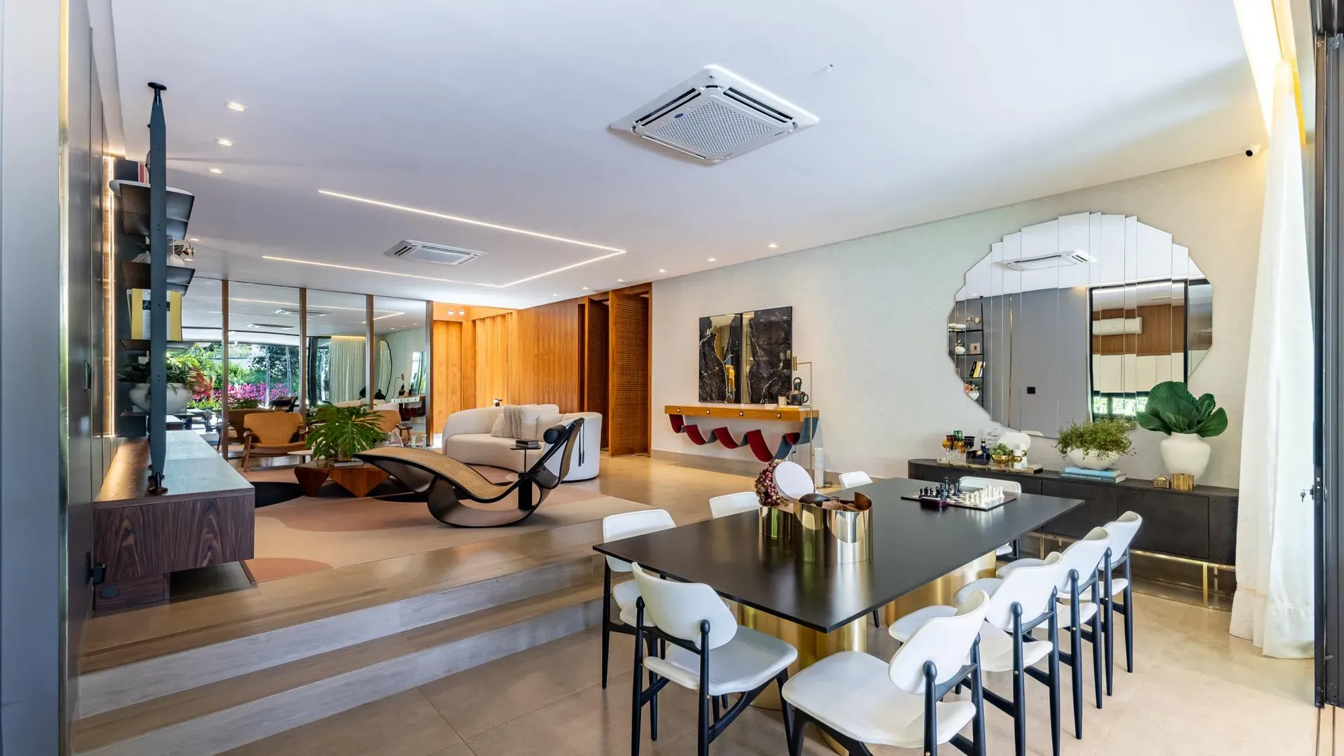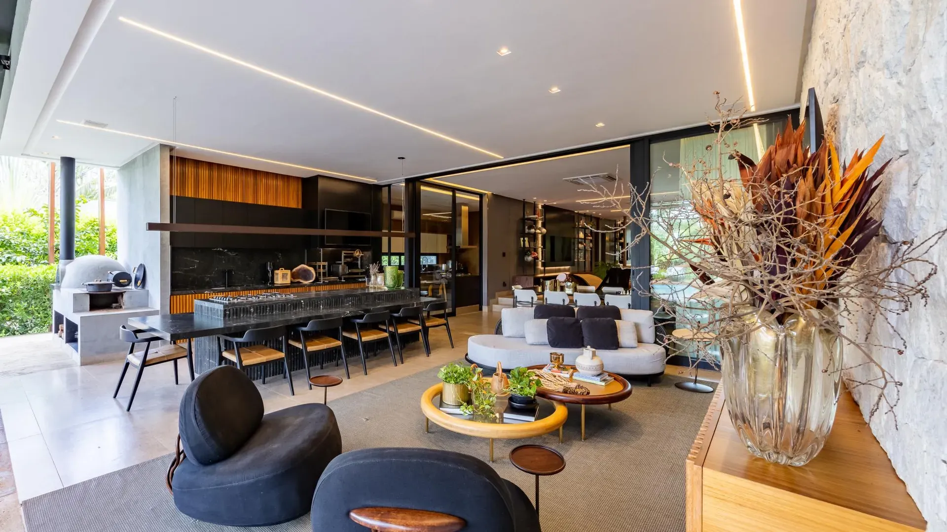 Sofisticação, conforto e integração com a natureza. Essas são as palavras que definem essa casa com 3 suítes no Aldeia do Vale. Morar no condomínio é um privilégio para poucos e com esse projeto arrojado e impecável, torna-se algo ainda mais especial. O hall de entrada já revela a imponência do projeto, com acabamentos em lâminas de madeira natural e luminárias assinadas por Jader Almeida. A sala de estar e TV, além de ampla e bem iluminada, traz peças icônicas, como as Cadeiras Diz de Sérgio Rodrigues e a Poltrona Rio de Oscar Niemeyer. Além de marcantes, formam a construção perfeita para um ambiente sofisticado e acolhedor. A fluidez segue nos outros ambientes: o lazer externo é de extremo bom gosto, com móveis de Leandro Garcia e Henrique Schreiber. Combinados com um paisagismo exuberante, tornam o espaço relaxante e repleto de personalidade. Receber a família ou amigos nessa área é proporcionar conforto ímpar, além de um visual que evoca tranquilidade e contemplação. Outro destaque é a piscina com deck de madeira, cercada por belas espreguiçadeiras. O espaço gourmet também merece menção, contando com churrasqueira, bar elegante, pergolado e projeto luminotécnico diferenciado. O Aldeia do Vale é sinônimo de privacidade e segurança para sua família. Além da exclusividade do condomínio, a localização permite um equilíbrio perfeito entre tranquilidade e conveniência, com uma variedade de comércios servindo o condomínio, de escolas a empórios, além de opções de alta gastronomia a poucos metros. Agende uma visita e conheça seu futuro lar com a Equipe HAUT. Uma negociação sob medida espera por você.
