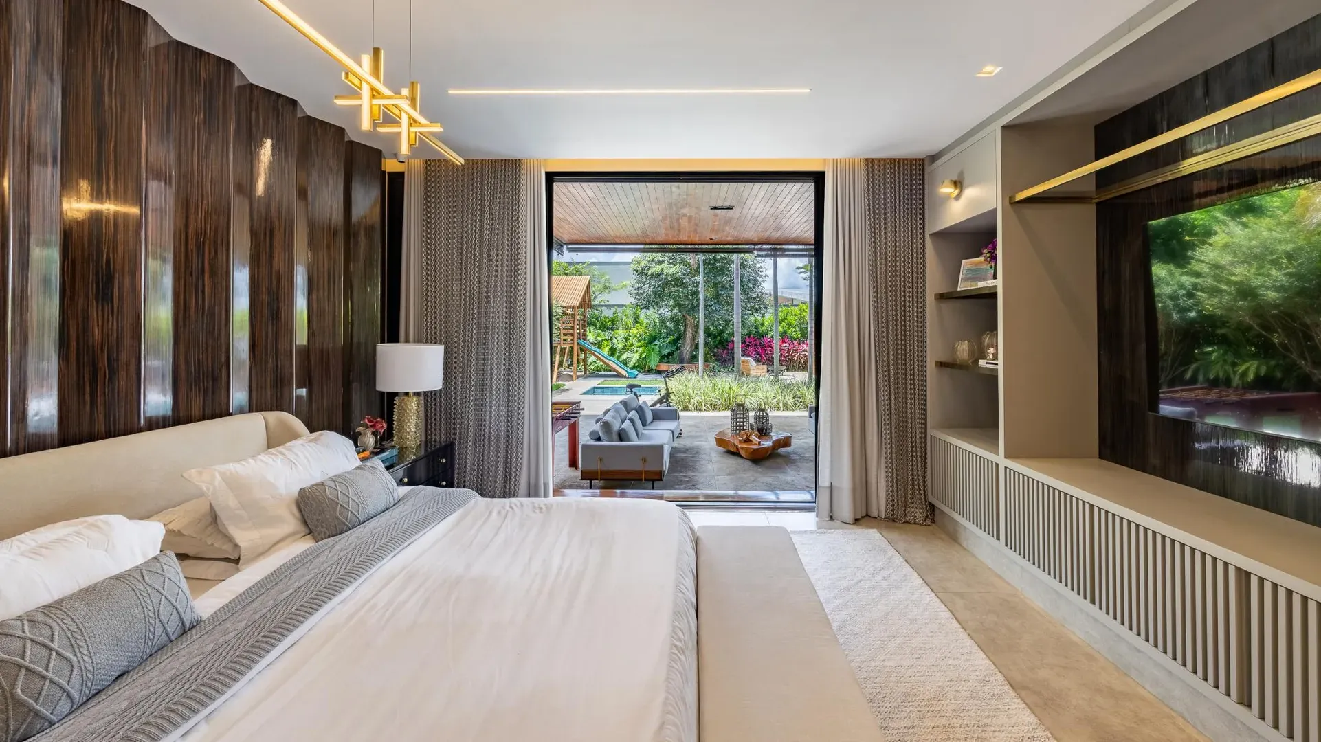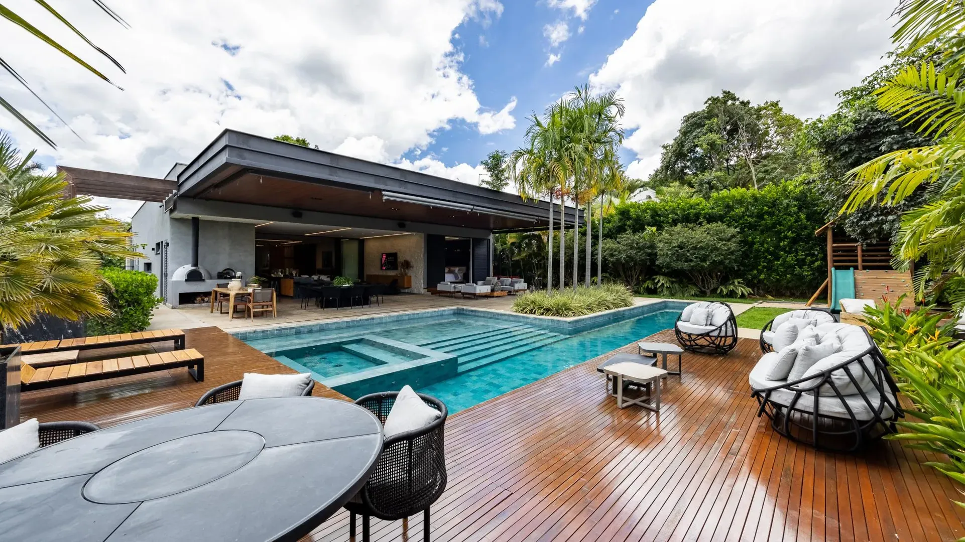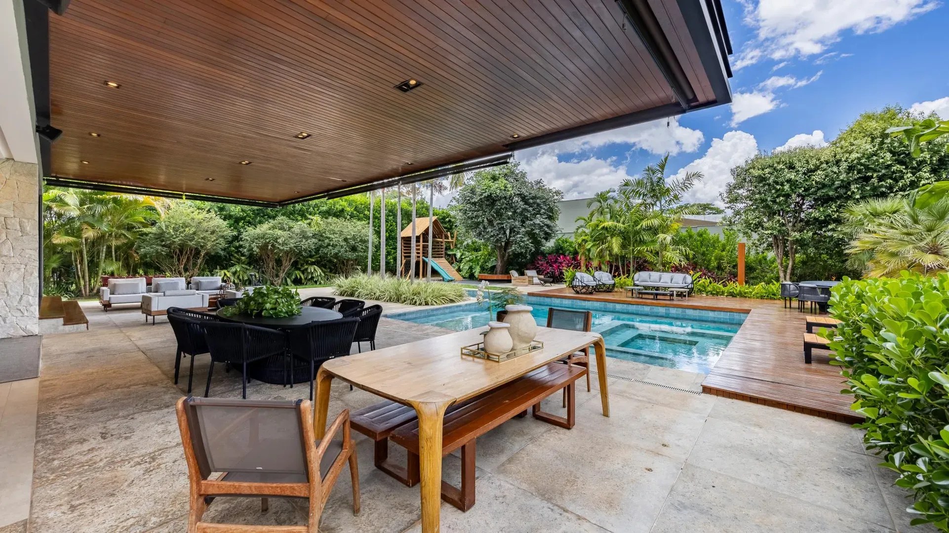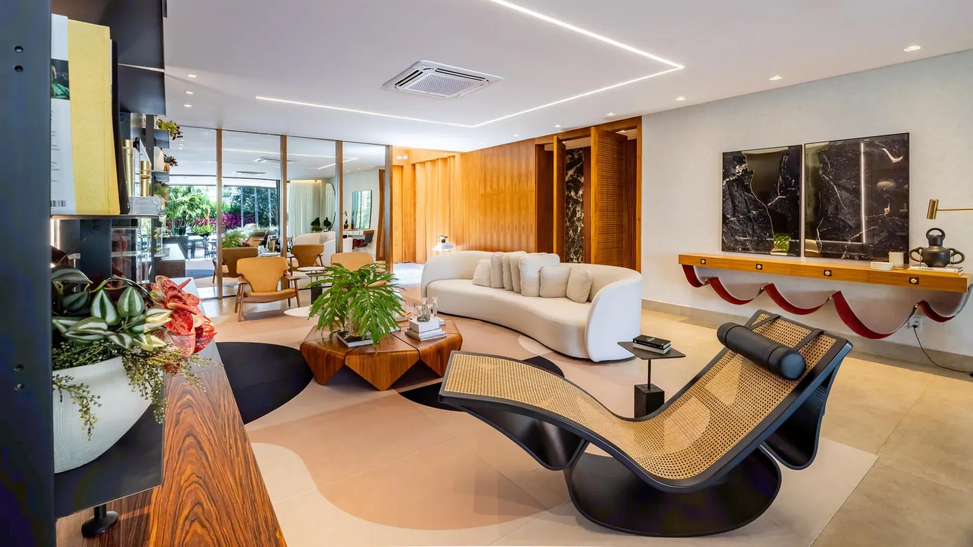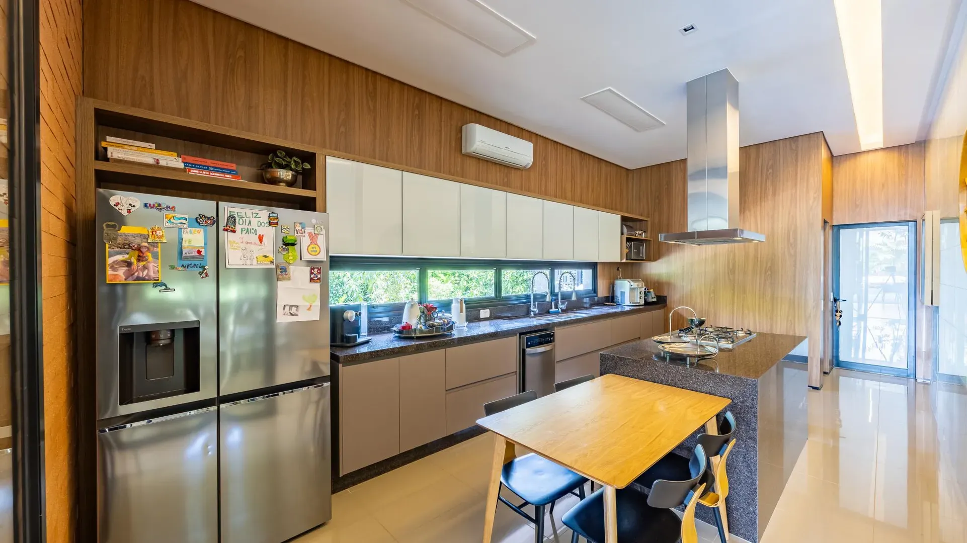 Sofisticação, conforto e integração com a natureza. Essas são as palavras que definem essa casa com 3 suítes no Aldeia do Vale. Morar no condomínio é um privilégio para poucos e com esse projeto arrojado e impecável, torna-se algo ainda mais especial. O hall de entrada já revela a imponência do projeto, com acabamentos em lâminas de madeira natural e luminárias assinadas por Jader Almeida. A sala de estar e TV, além de ampla e bem iluminada, traz peças icônicas, como as Cadeiras Diz de Sérgio Rodrigues e a Poltrona Rio de Oscar Niemeyer. Além de marcantes, formam a construção perfeita para um ambiente sofisticado e acolhedor. A fluidez segue nos outros ambientes: o lazer externo é de extremo bom gosto, com móveis de Leandro Garcia e Henrique Schreiber. Combinados com um paisagismo exuberante, tornam o espaço relaxante e repleto de personalidade. Receber a família ou amigos nessa área é proporcionar conforto ímpar, além de um visual que evoca tranquilidade e contemplação. Outro destaque é a piscina com deck de madeira, cercada por belas espreguiçadeiras. O espaço gourmet também merece menção, contando com churrasqueira, bar elegante, pergolado e projeto luminotécnico diferenciado. O Aldeia do Vale é sinônimo de privacidade e segurança para sua família. Além da exclusividade do condomínio, a localização permite um equilíbrio perfeito entre tranquilidade e conveniência, com uma variedade de comércios servindo o condomínio, de escolas a empórios, além de opções de alta gastronomia a poucos metros. Agende uma visita e conheça seu futuro lar com a Equipe HAUT. Uma negociação sob medida espera por você.