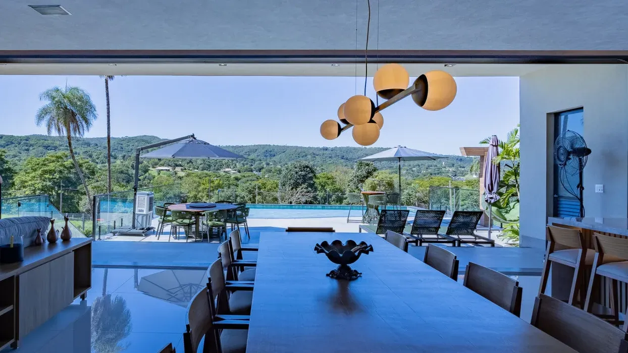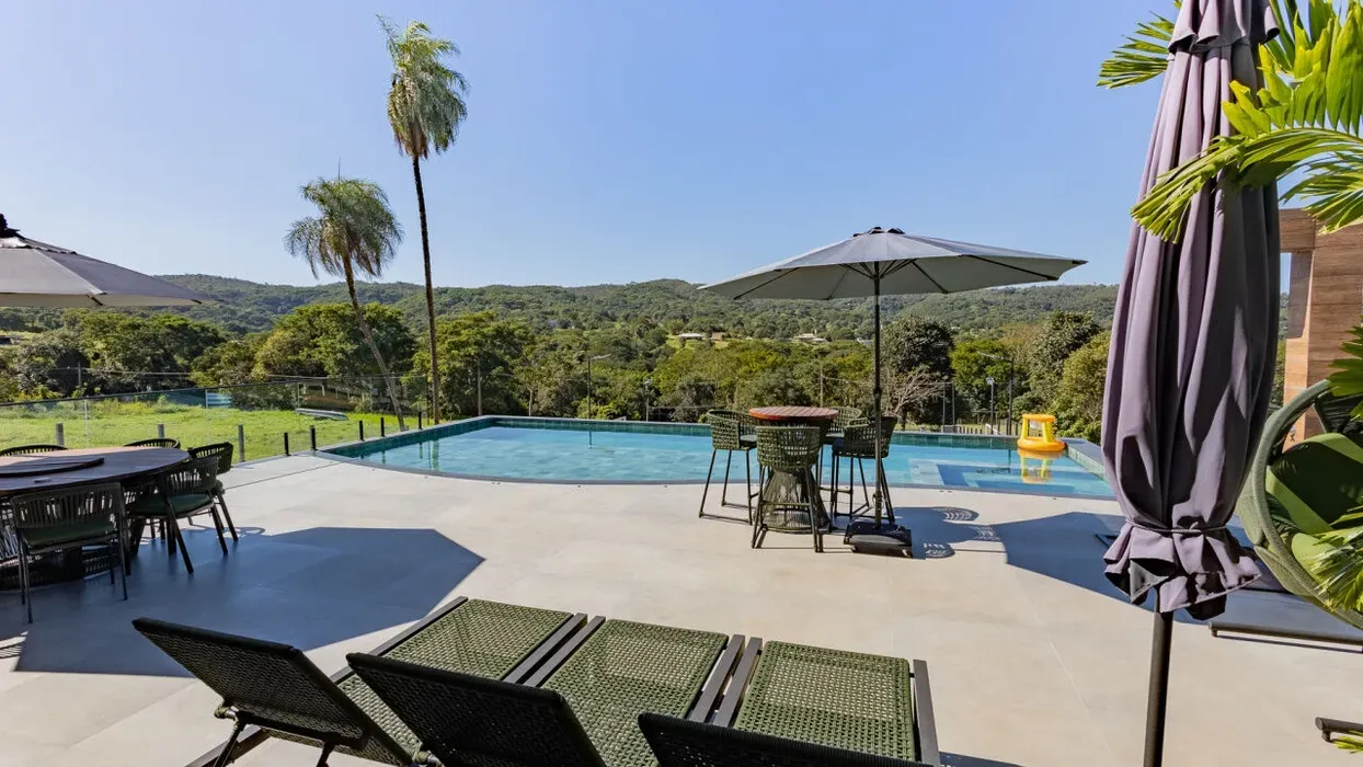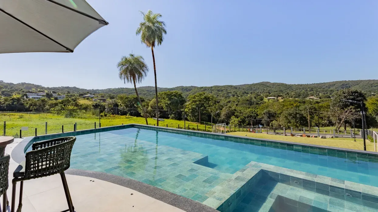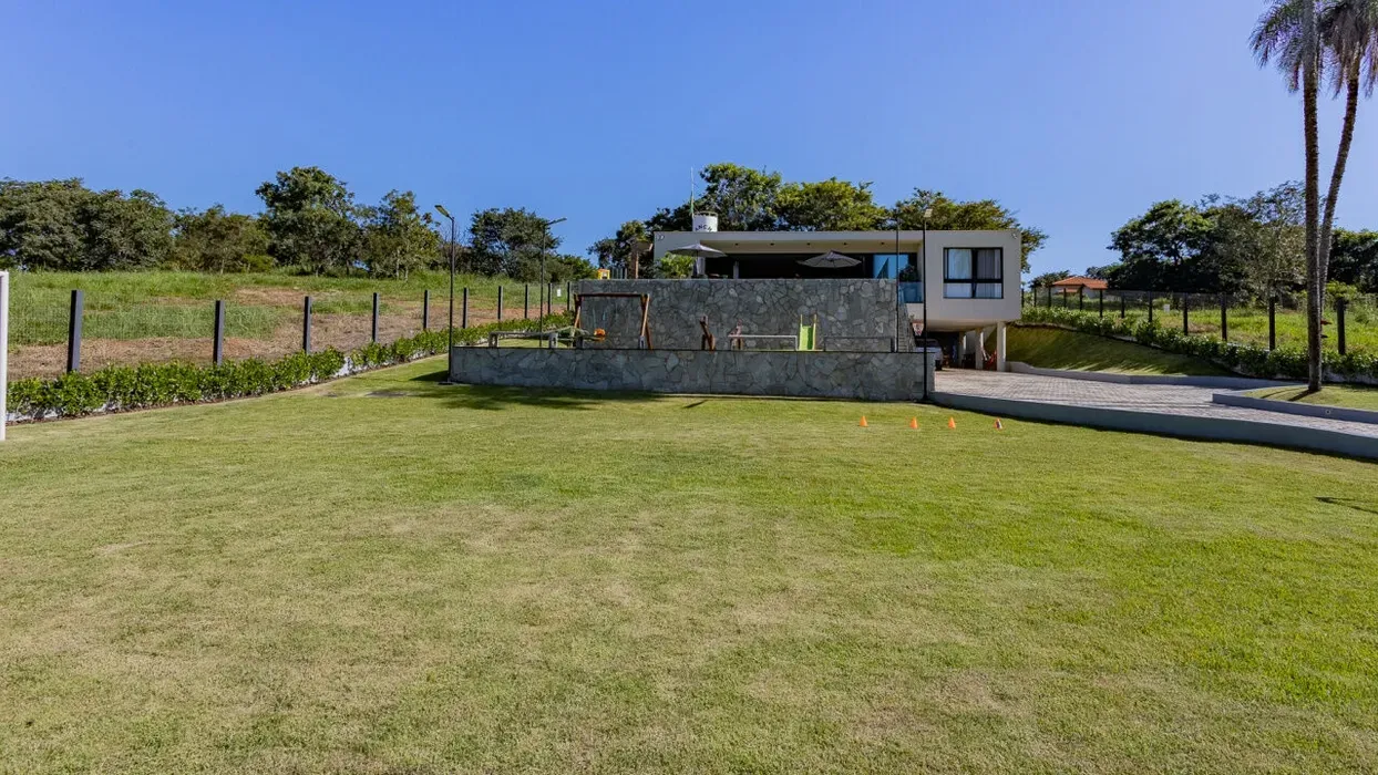 Rancho exclusivo mobiliado e decorado, á 30 minutos de Goiânia – BR 153 Condomínio Águas da Serra 2 mil m² de terreno com 420 m² de construção com 4 suítes plenas, escritório, dispensa, depósito, cozinha integrada, lavabo, DCE. Piscina com borda infinita com vista linda para o verde. Poço artesiano com 15 mil litros Irrigação automatizada Gerador de energia Aquecimento solar O condomínio conta com: 1 milhão de m² de área verde 10 lagos Pesca e esportes náuticos Piscina adulto e infantil Quadra de tênis Futebol society Quadra poliesportiva Vôlei de areia Churrasqueira e salão de festas Restaurante Fazendinha com animais e frutas