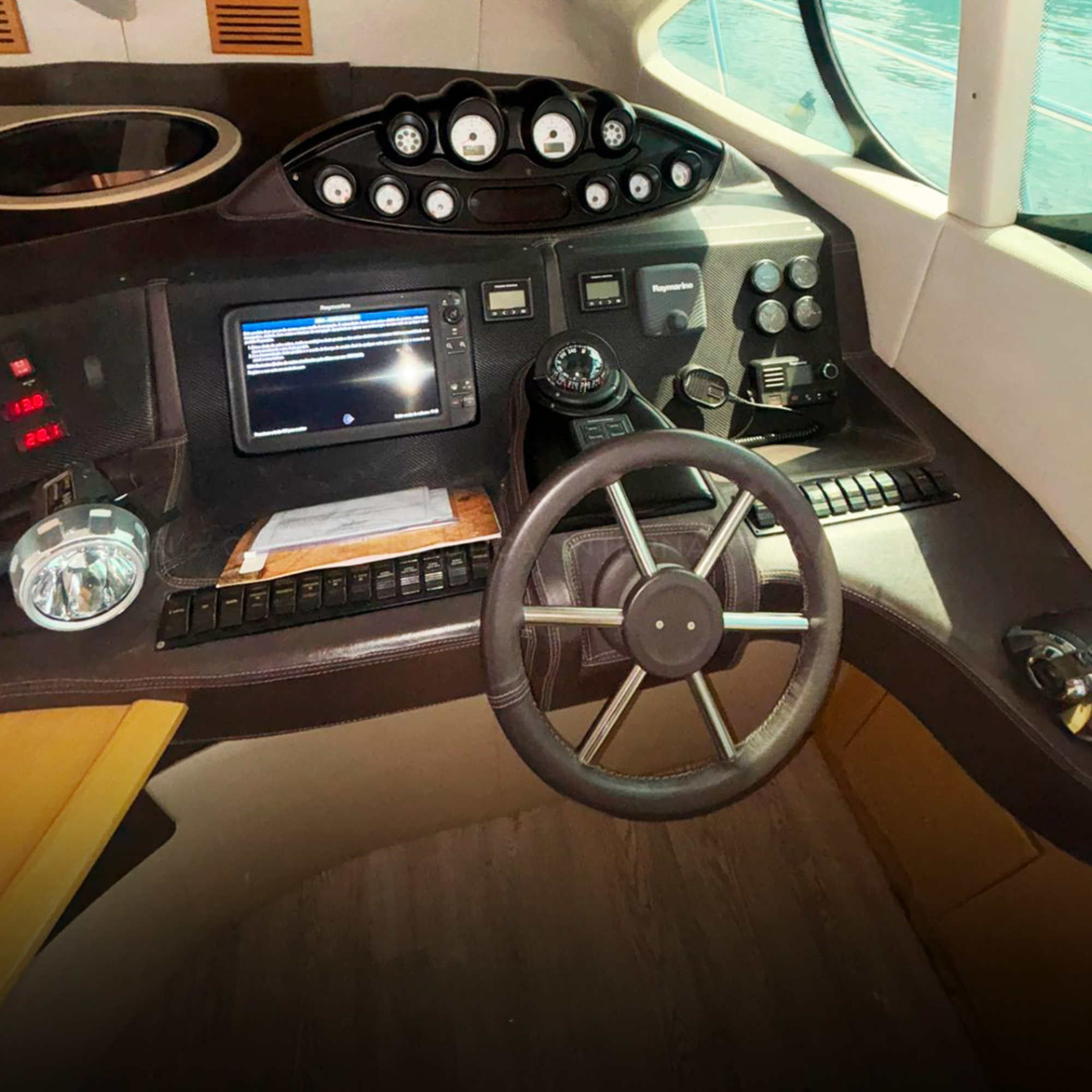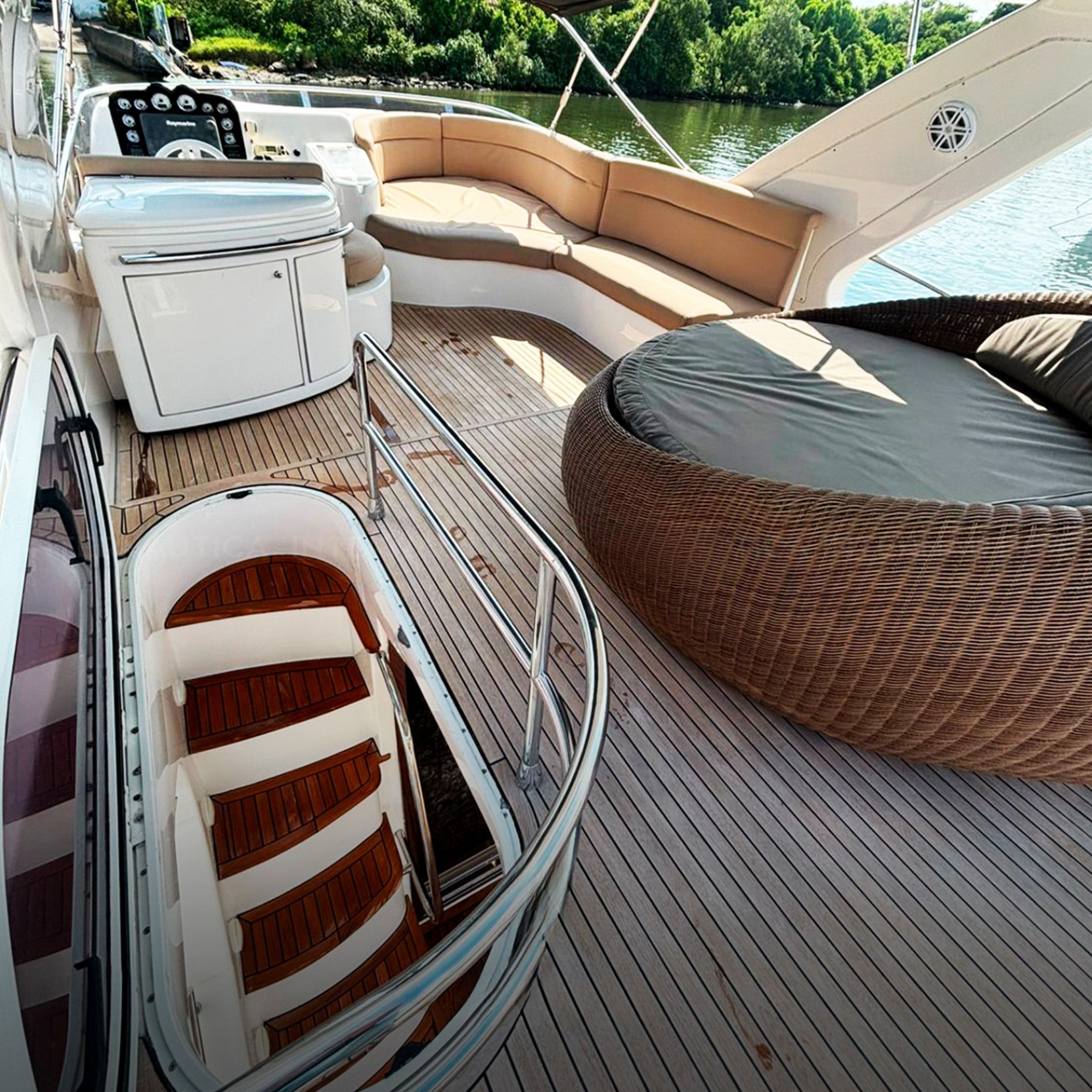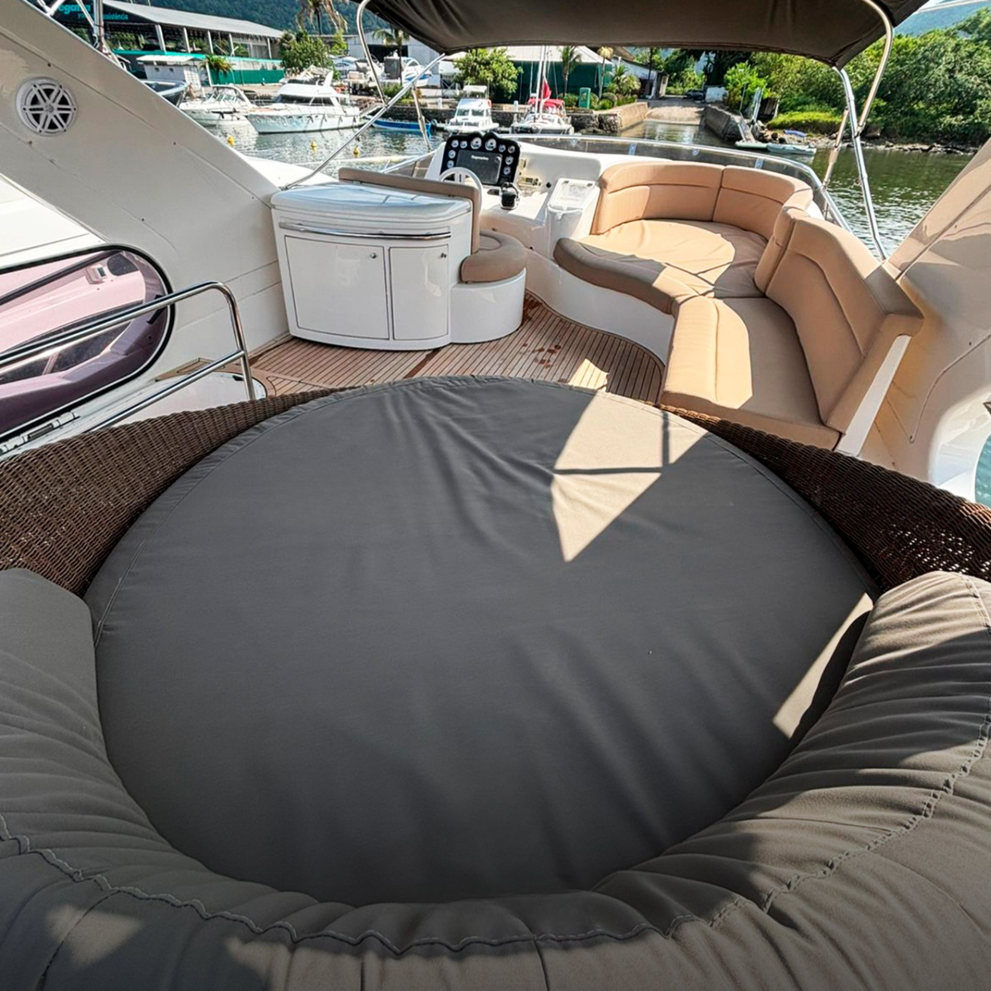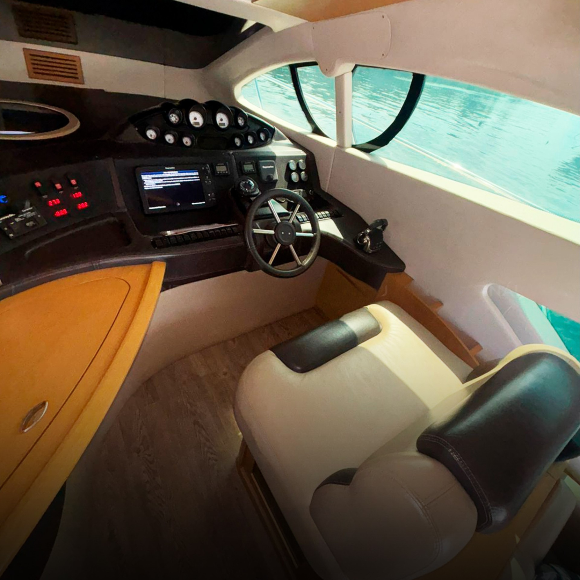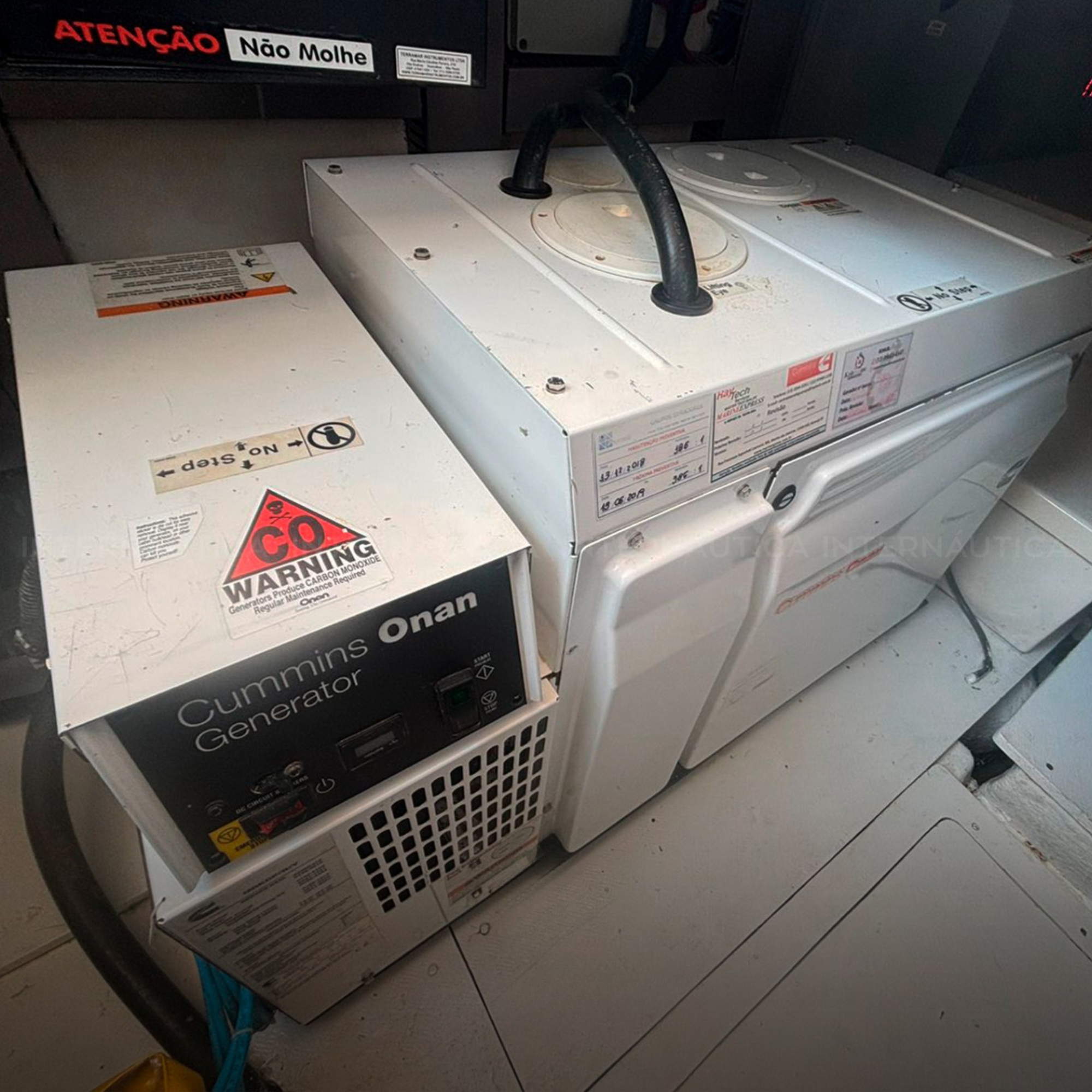 Antena TV, Ar Condicionado, Boiler, Bússola, Capota, Carregador de Baterias, Churrasqueira, Chuveiro de Popa, Cristaleira, Comando Eletrônico, Direção Hidráulica, Farol Robotizado, Flaps Hidráulicos, Geladeira, Geleira, Gerador, Gerador Horas: 1053, GPS, GPS Fly, Guincho Elétrico, Inversor, Rádio VHF, Rádio VHF Fly, Solário de Proa, Som, Sonda, Strobolight, Teka Patamar de Popa, Teka Praça de Popa, Televisão, Tomada de Cais, WC Elétrico
