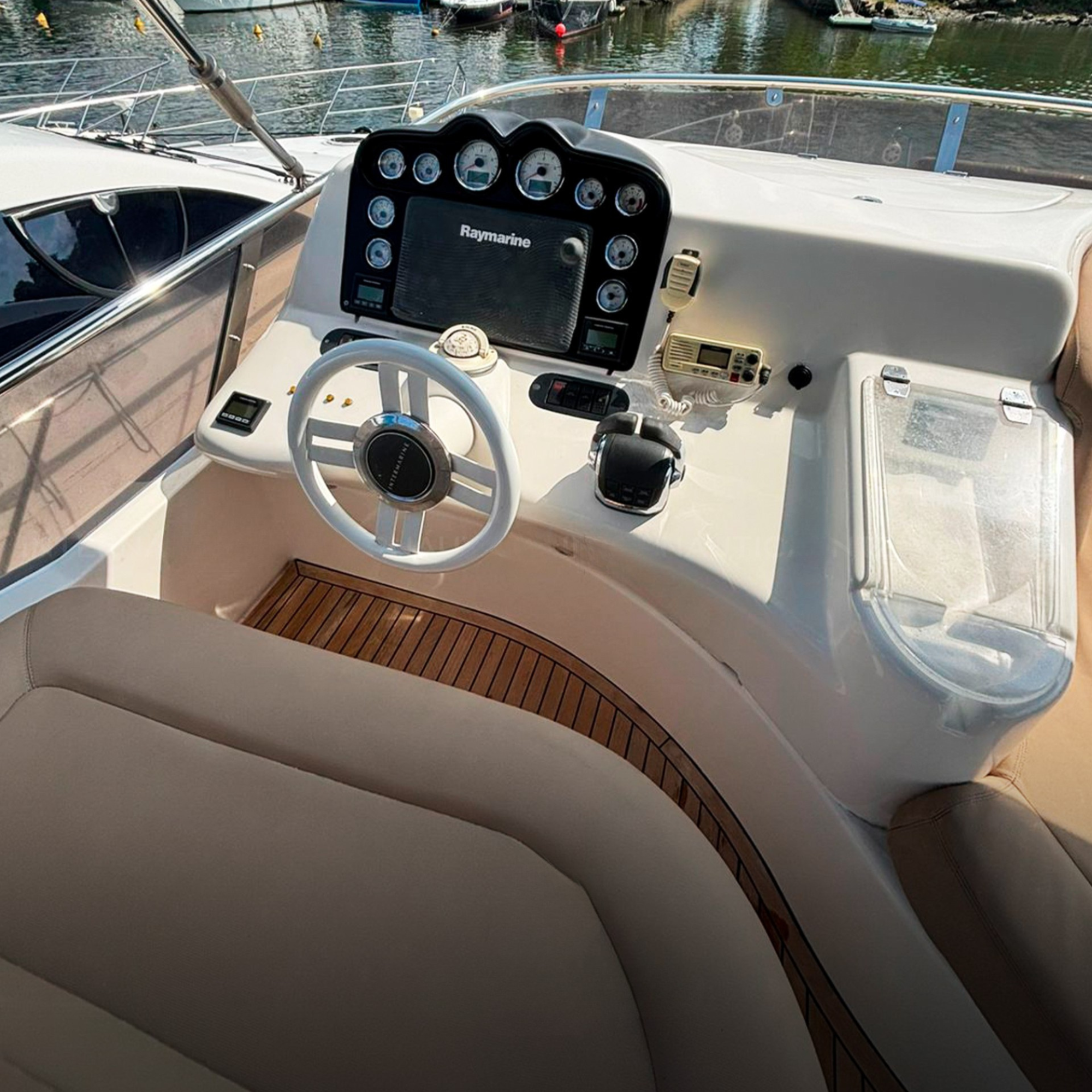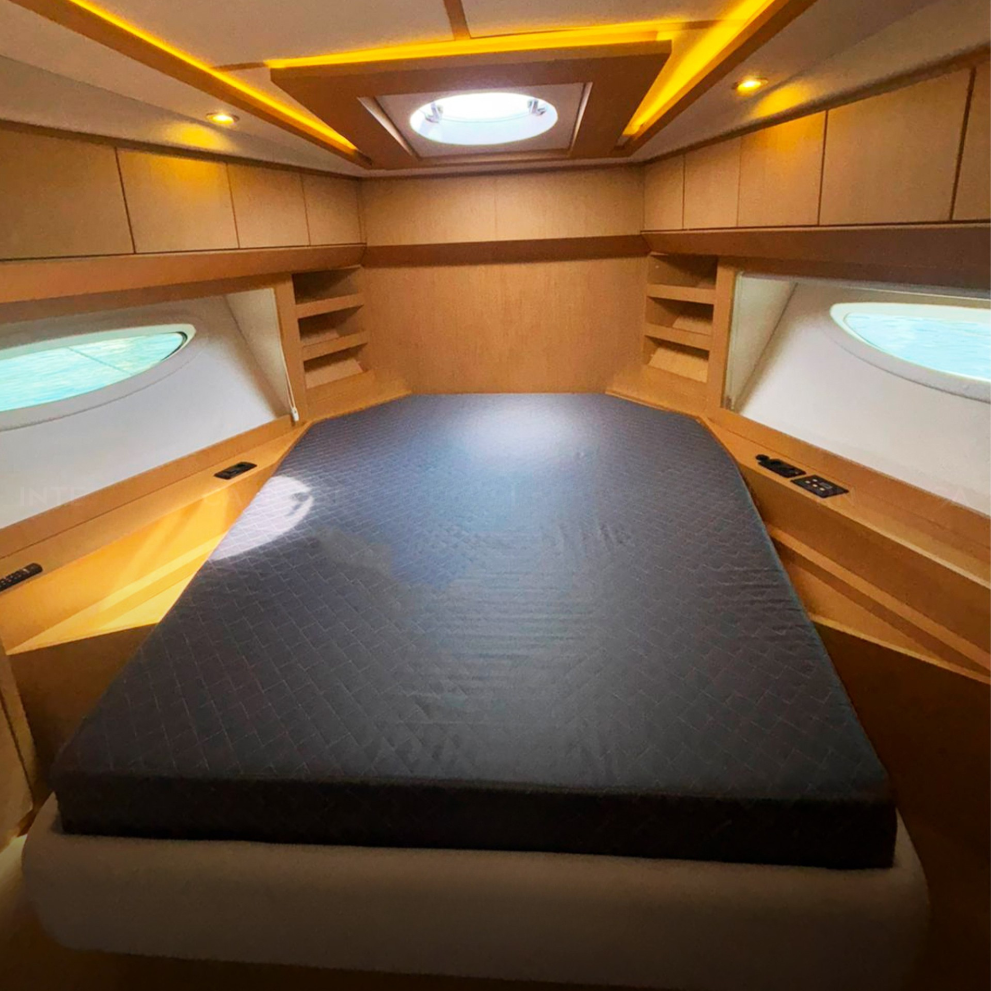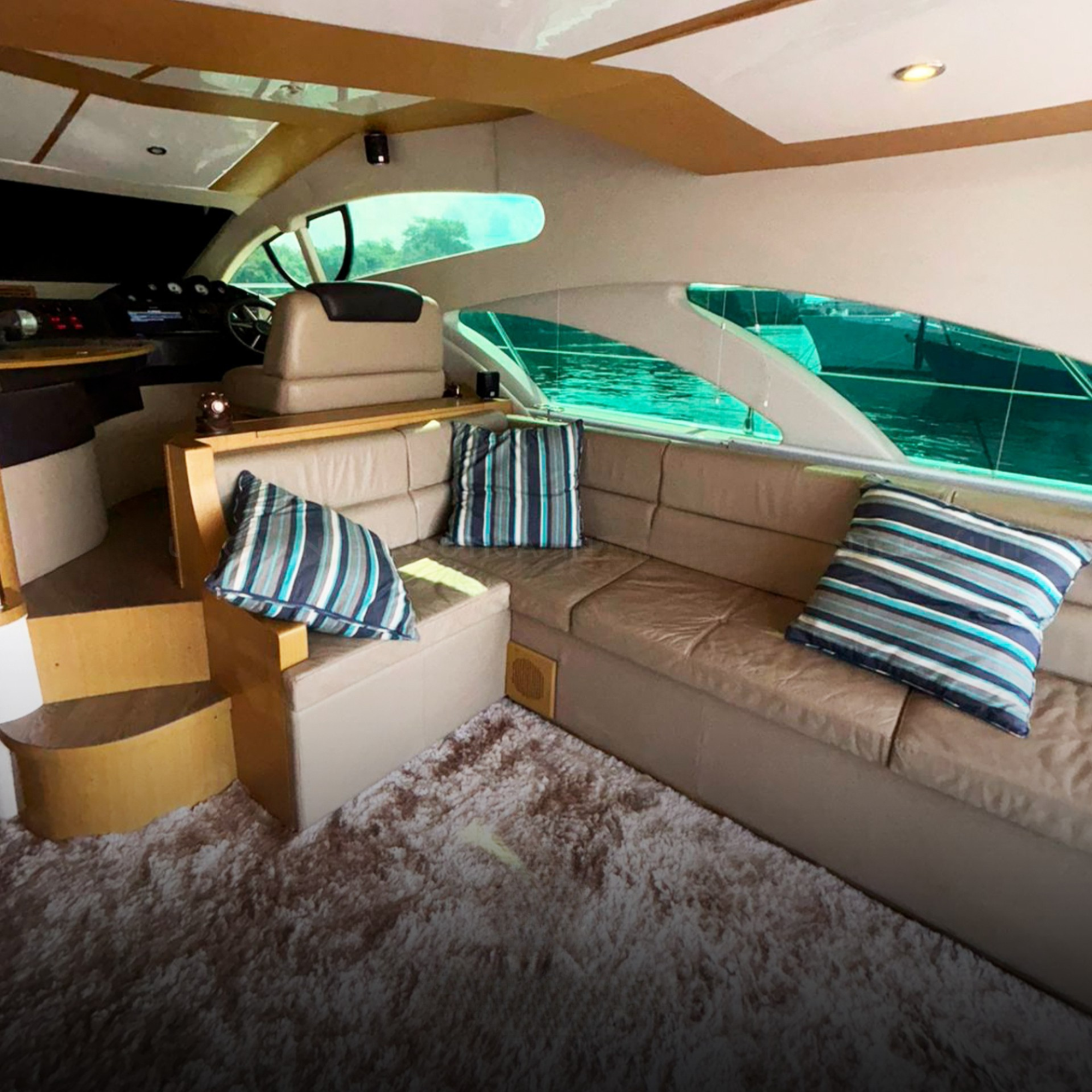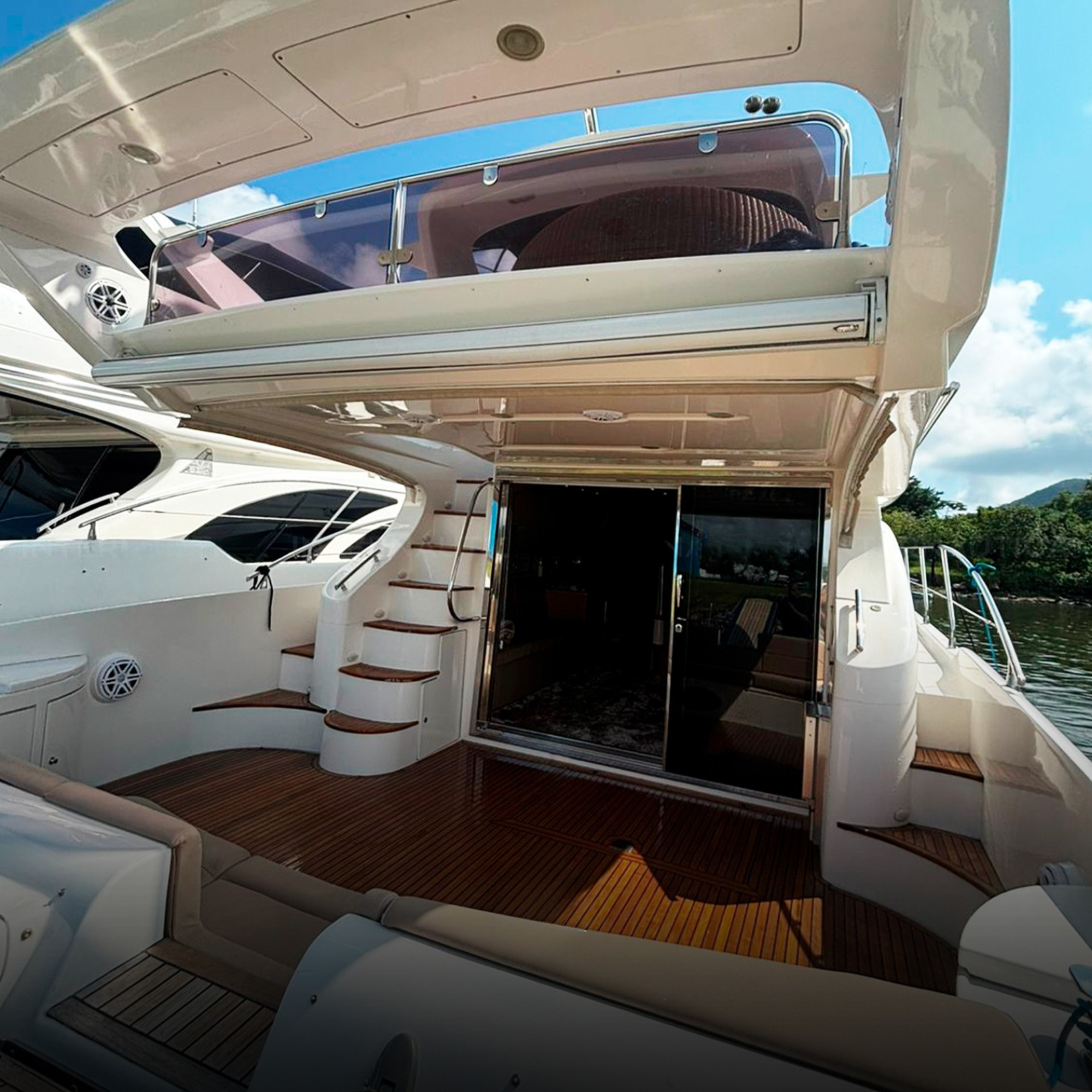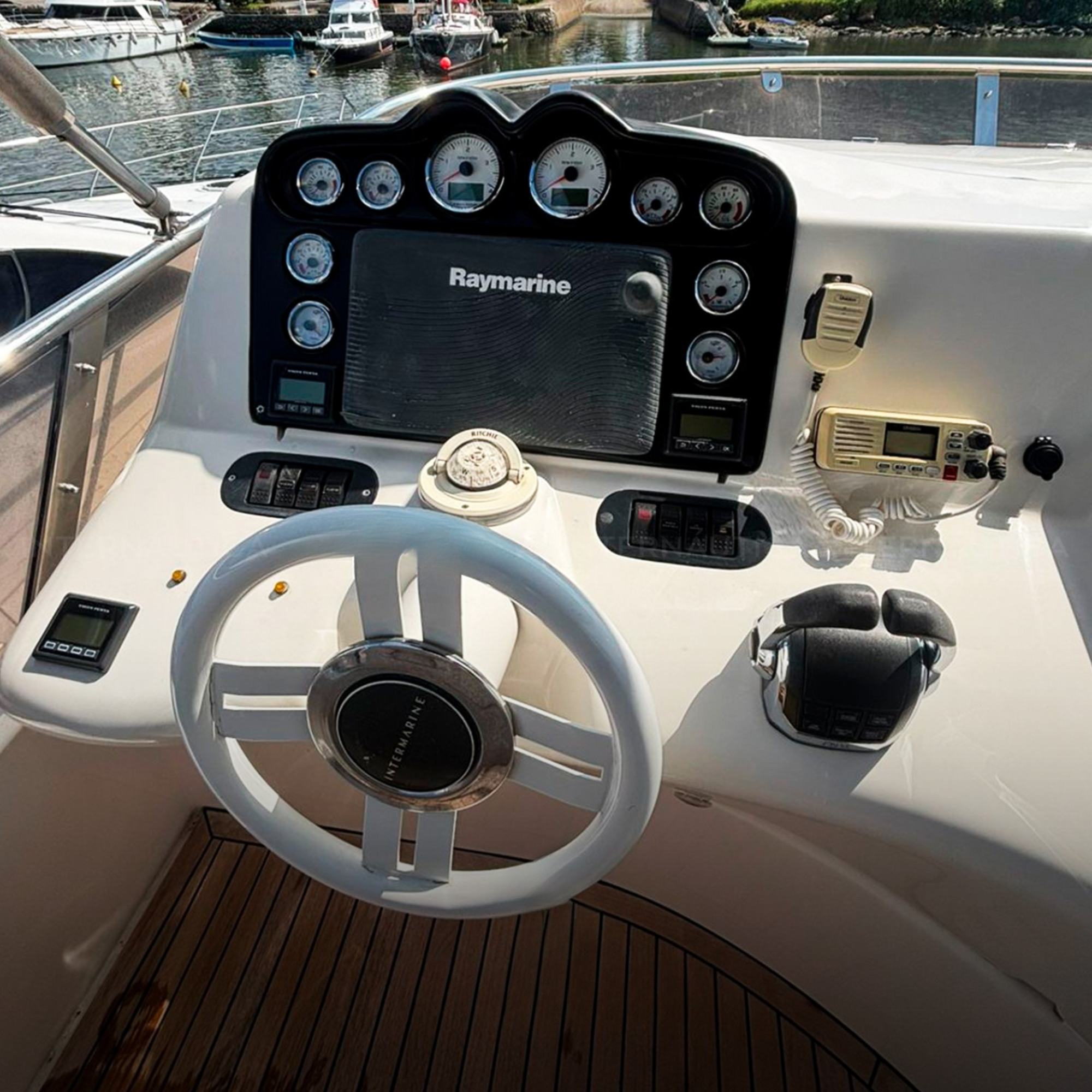 Antena TV, Ar Condicionado, Boiler, Bússola, Capota, Carregador de Baterias, Churrasqueira, Chuveiro de Popa, Cristaleira, Comando Eletrônico, Direção Hidráulica, Farol Robotizado, Flaps Hidráulicos, Geladeira, Geleira, Gerador, Gerador Horas: 1053, GPS, GPS Fly, Guincho Elétrico, Inversor, Rádio VHF, Rádio VHF Fly, Solário de Proa, Som, Sonda, Strobolight, Teka Patamar de Popa, Teka Praça de Popa, Televisão, Tomada de Cais, WC Elétrico