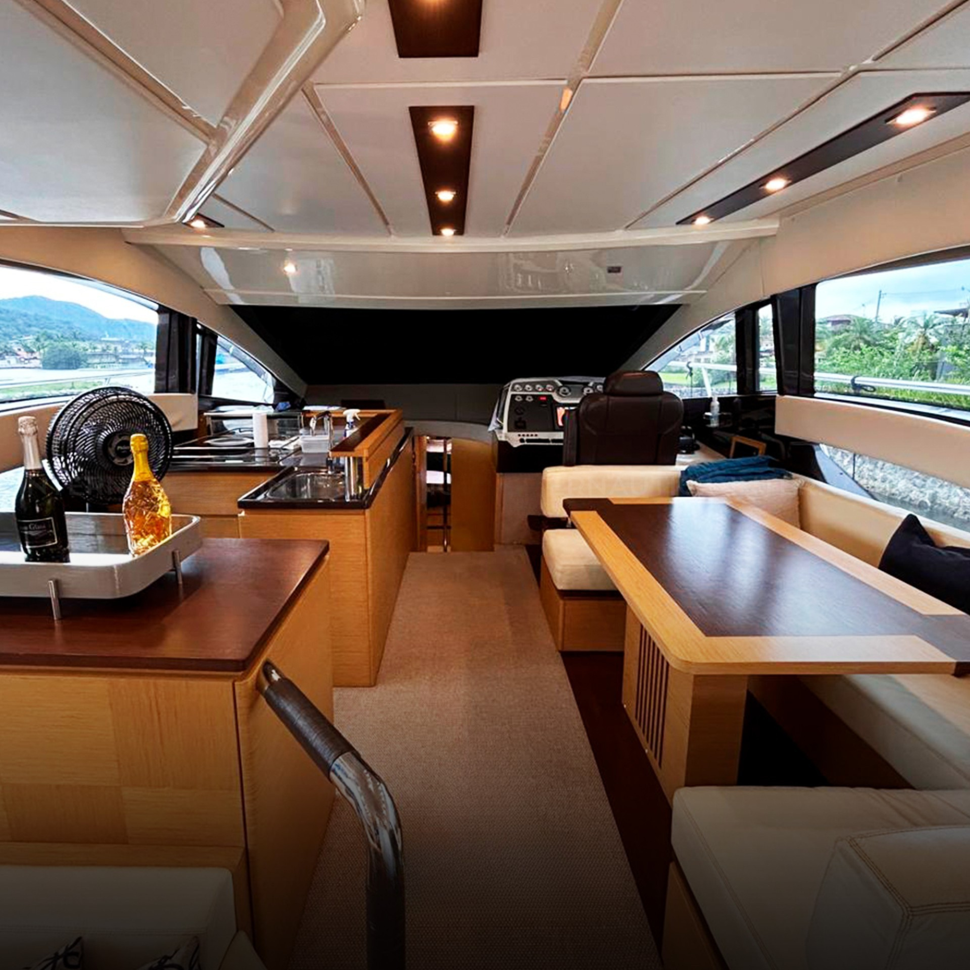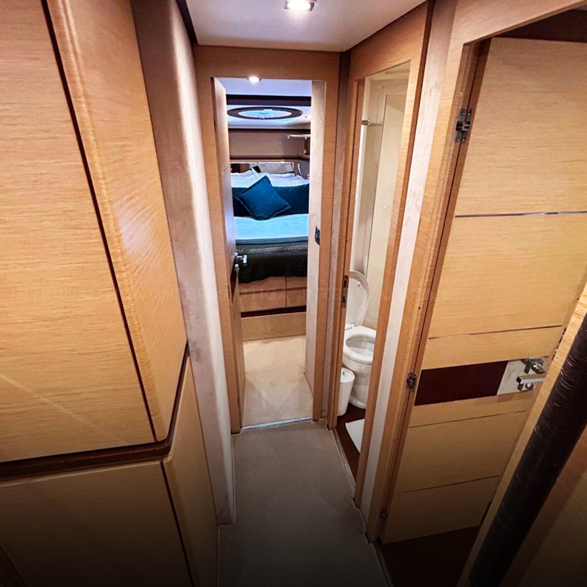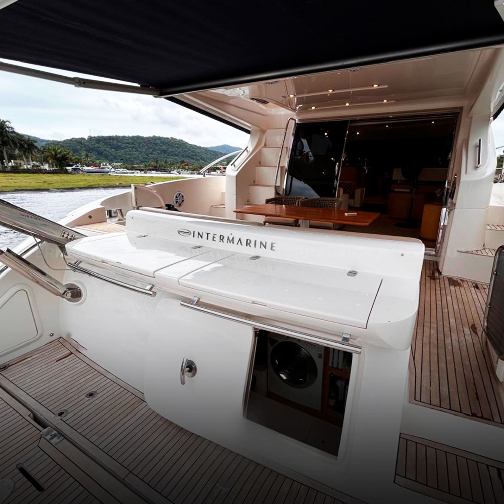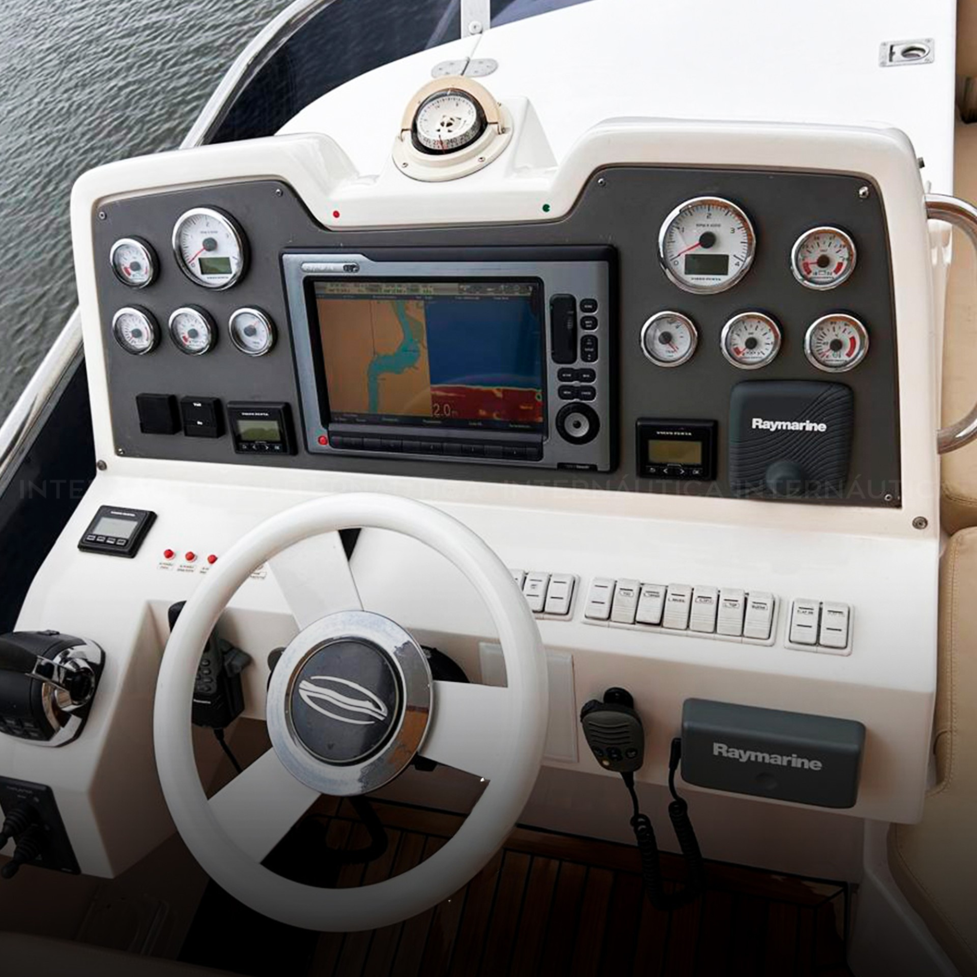Antena TV, Ar Condicionado, Boiler, Bússola, Capota, Carregador de Baterias, Churrasqueira, Chuveiro de Popa, Cristaleira, Comando Eletrônico, Farol Robotizado, Flaps Hidráulicos, Fogão Elétrico, Geladeira, Geleira, Gerador, GPS, GPS Fly, Guincho Elétrico, Inversor, Plataforma Submergível, Piloto Automático, Rádio VHF, Som, Sonda, Teka Patamar de Popa, Teka Praça de Popa, Televisão, Tomada de Cais, WC Elétrico, Quartos: 3, Banheiros: 3