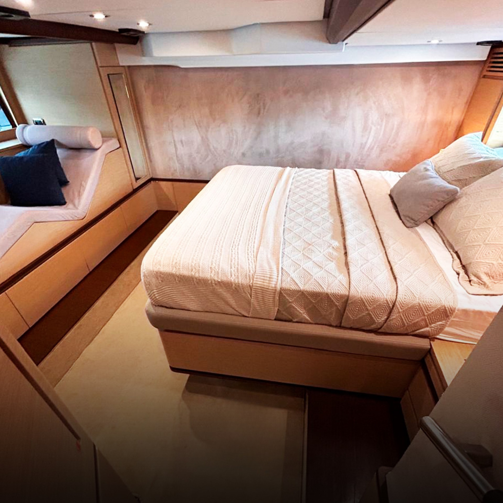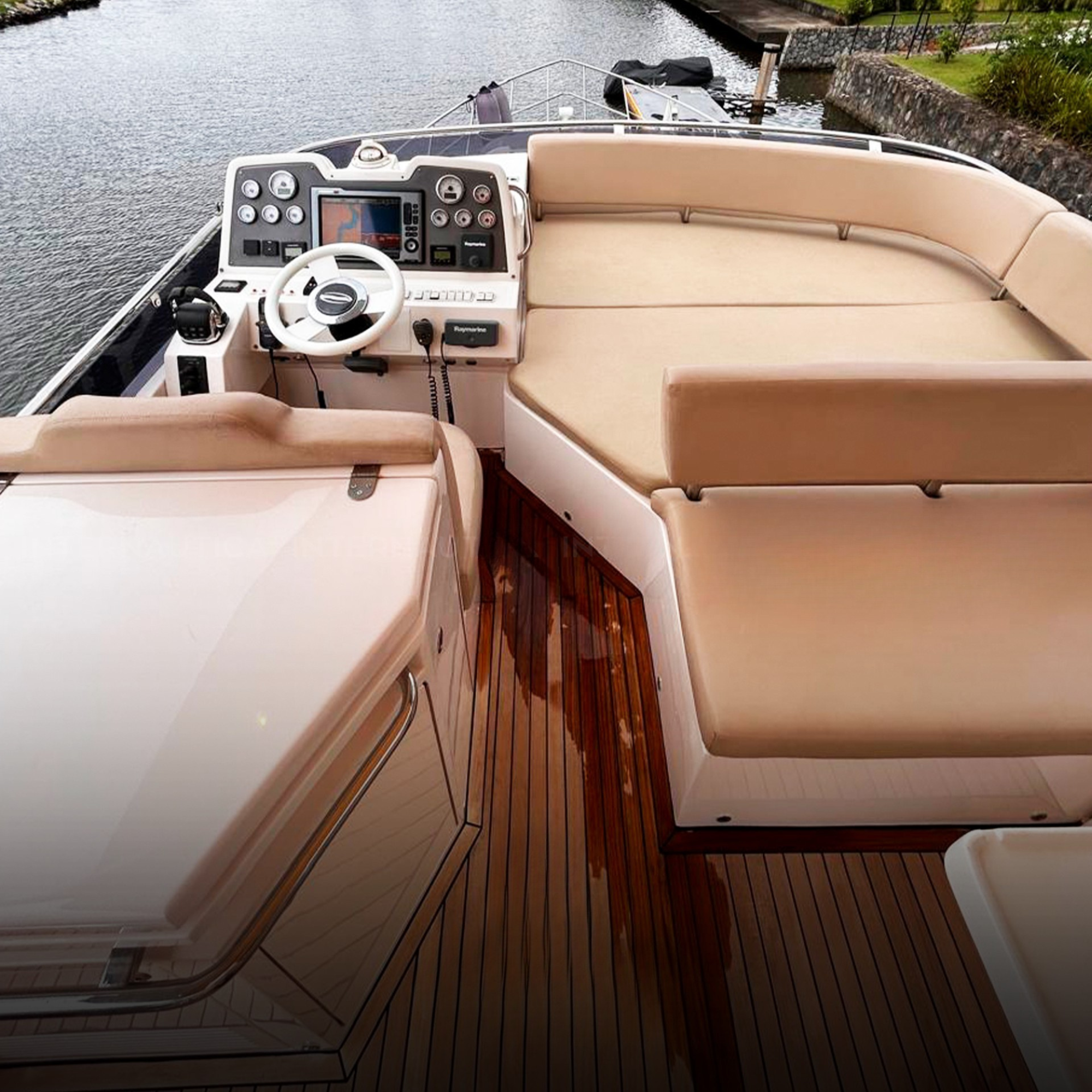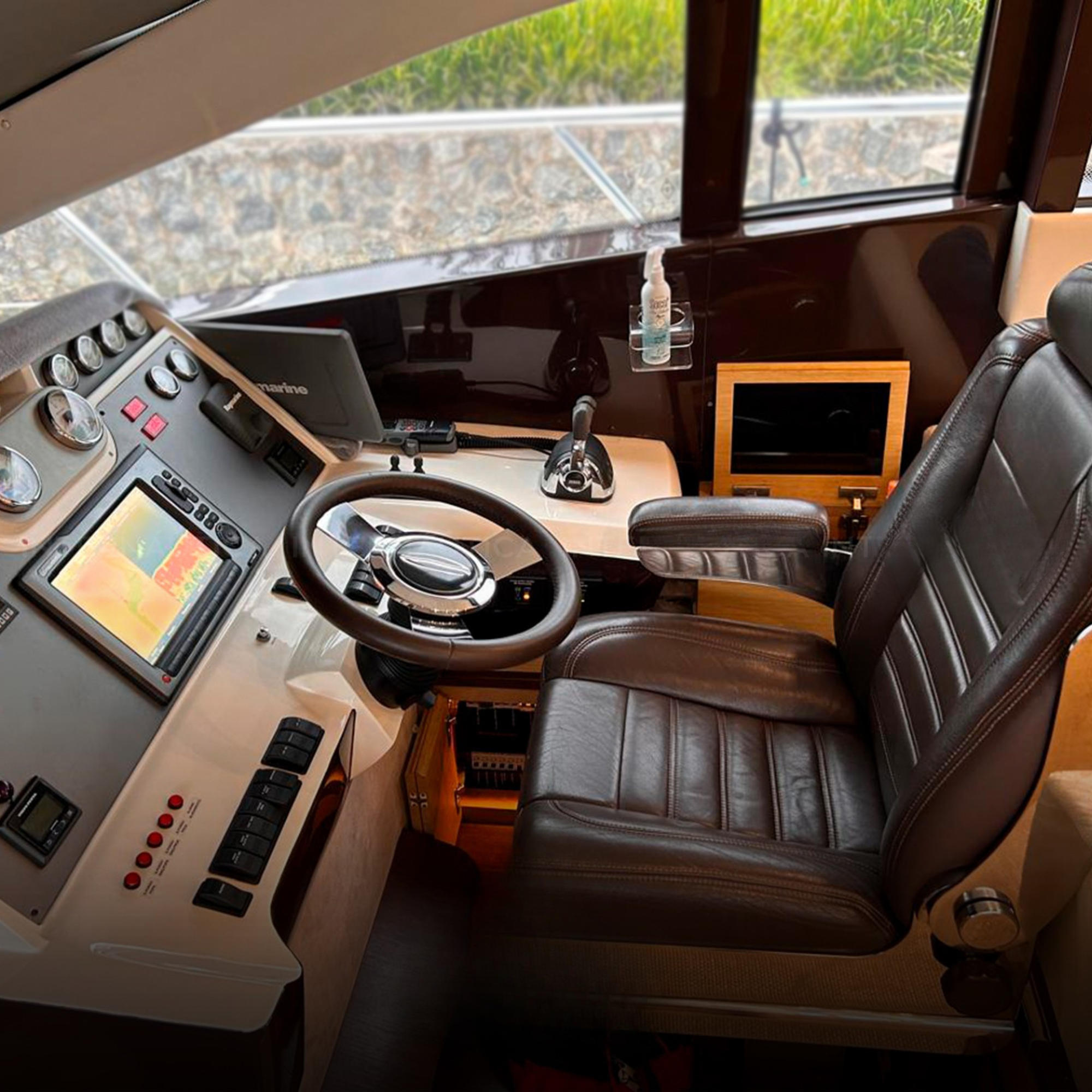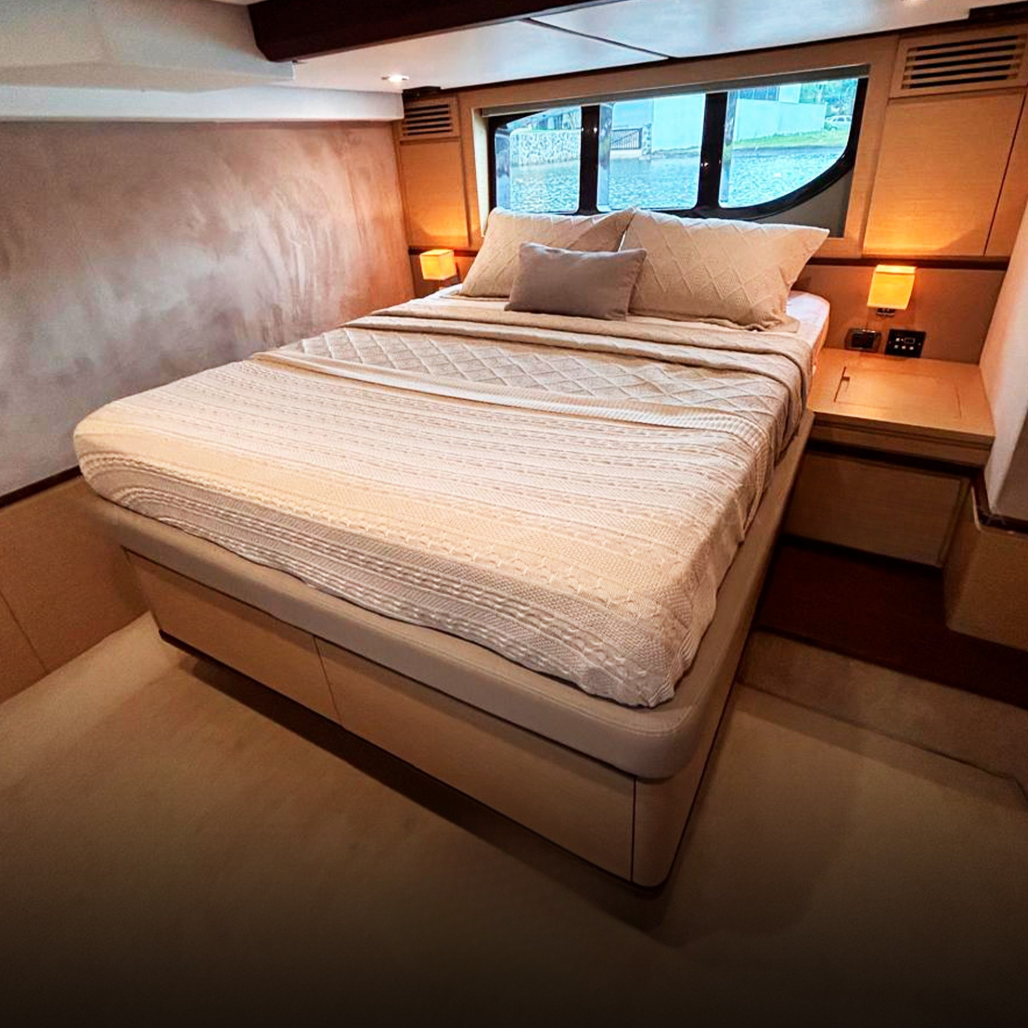 Antena TV, Ar Condicionado, Boiler, Bússola, Capota, Carregador de Baterias, Churrasqueira, Chuveiro de Popa, Cristaleira, Comando Eletrônico, Farol Robotizado, Flaps Hidráulicos, Fogão Elétrico, Geladeira, Geleira, Gerador, GPS, GPS Fly, Guincho Elétrico, Inversor, Plataforma Submergível, Piloto Automático, Rádio VHF, Som, Sonda, Teka Patamar de Popa, Teka Praça de Popa, Televisão, Tomada de Cais, WC Elétrico, Quartos: 3, Banheiros: 3