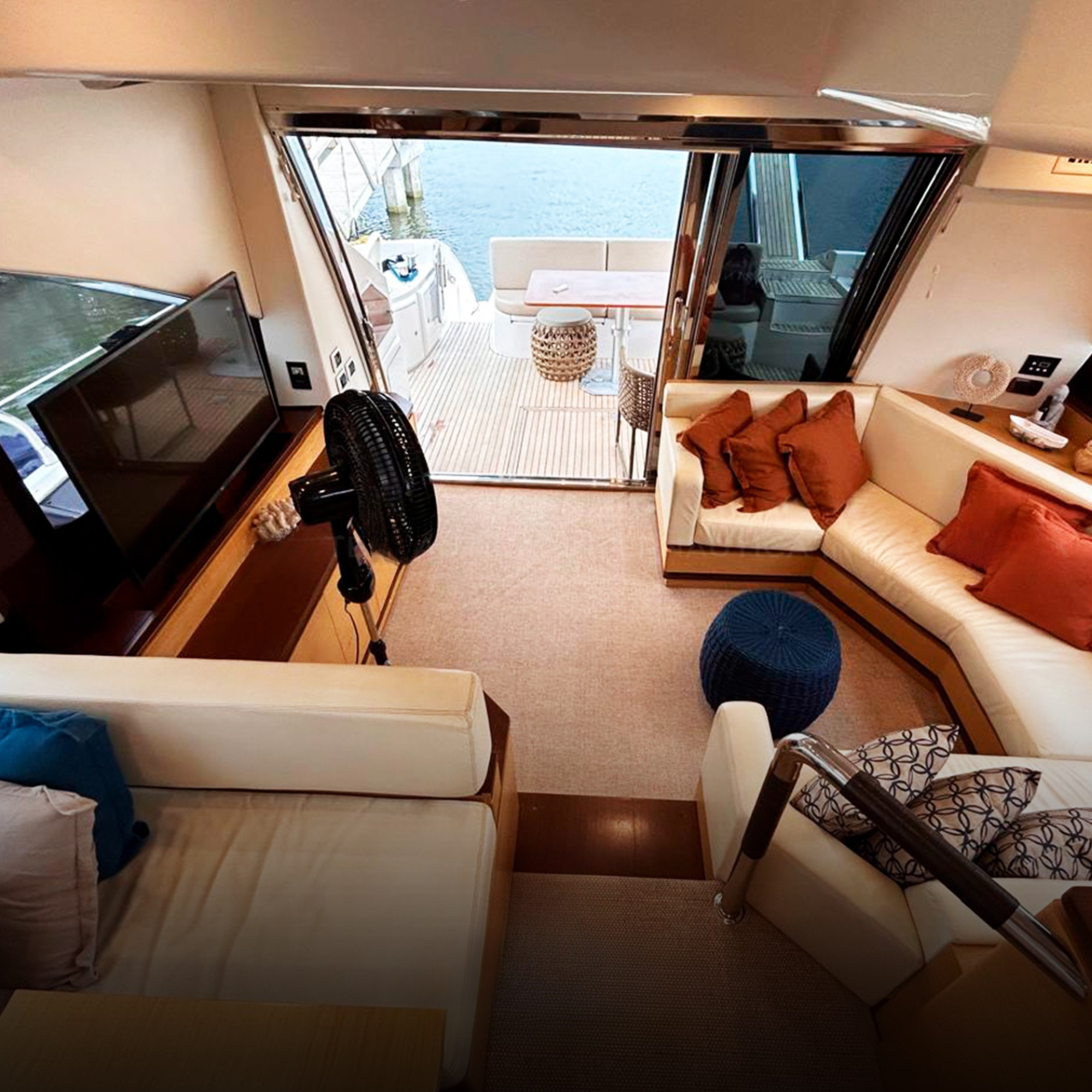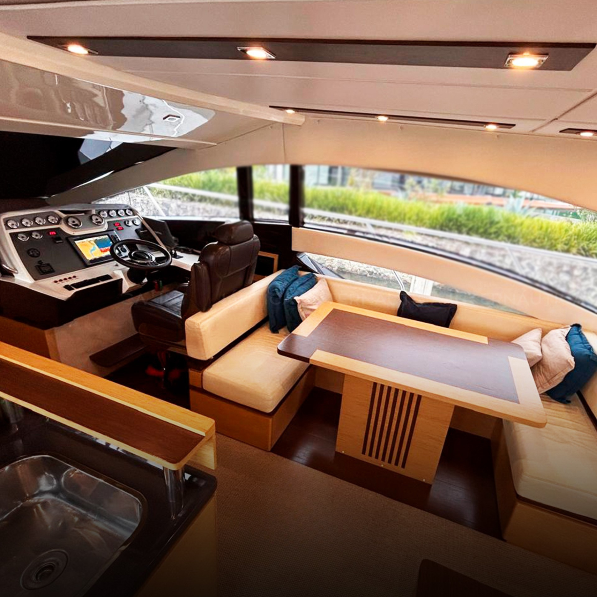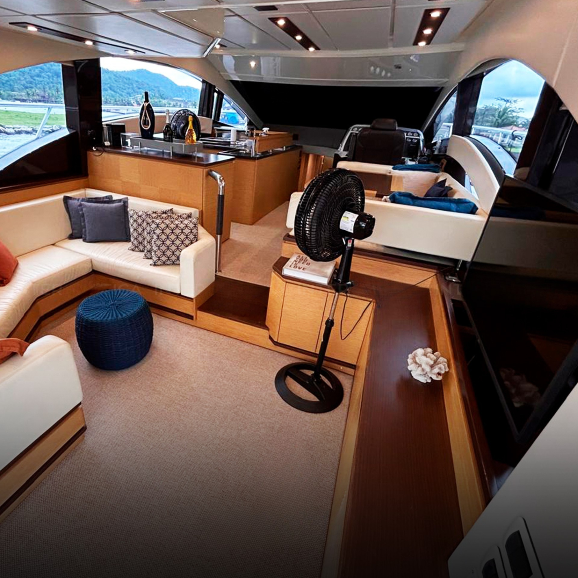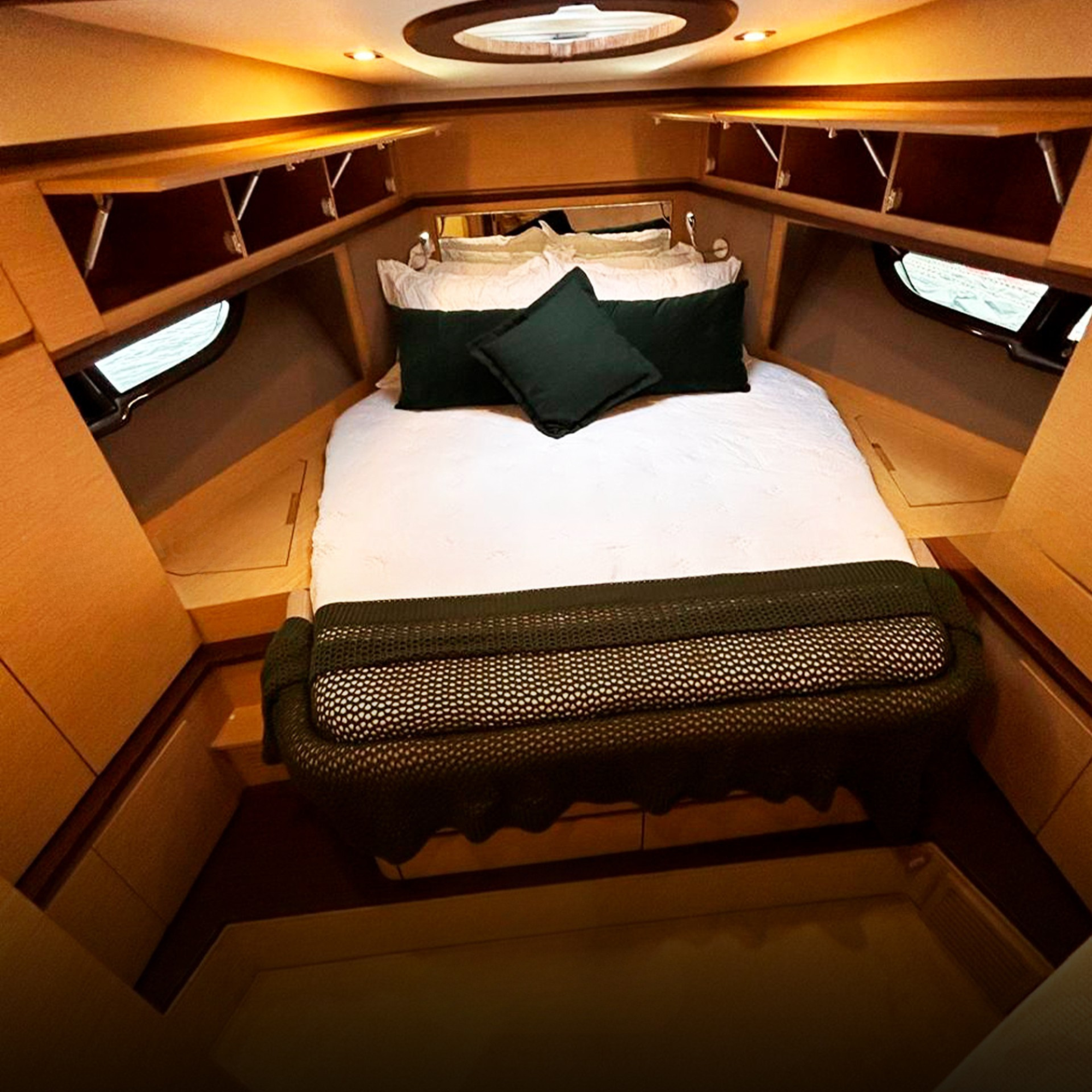 Antena TV, Ar Condicionado, Boiler, Bússola, Capota, Carregador de Baterias, Churrasqueira, Chuveiro de Popa, Cristaleira, Comando Eletrônico, Farol Robotizado, Flaps Hidráulicos, Fogão Elétrico, Geladeira, Geleira, Gerador, GPS, GPS Fly, Guincho Elétrico, Inversor, Plataforma Submergível, Piloto Automático, Rádio VHF, Som, Sonda, Teka Patamar de Popa, Teka Praça de Popa, Televisão, Tomada de Cais, WC Elétrico, Quartos: 3, Banheiros: 3