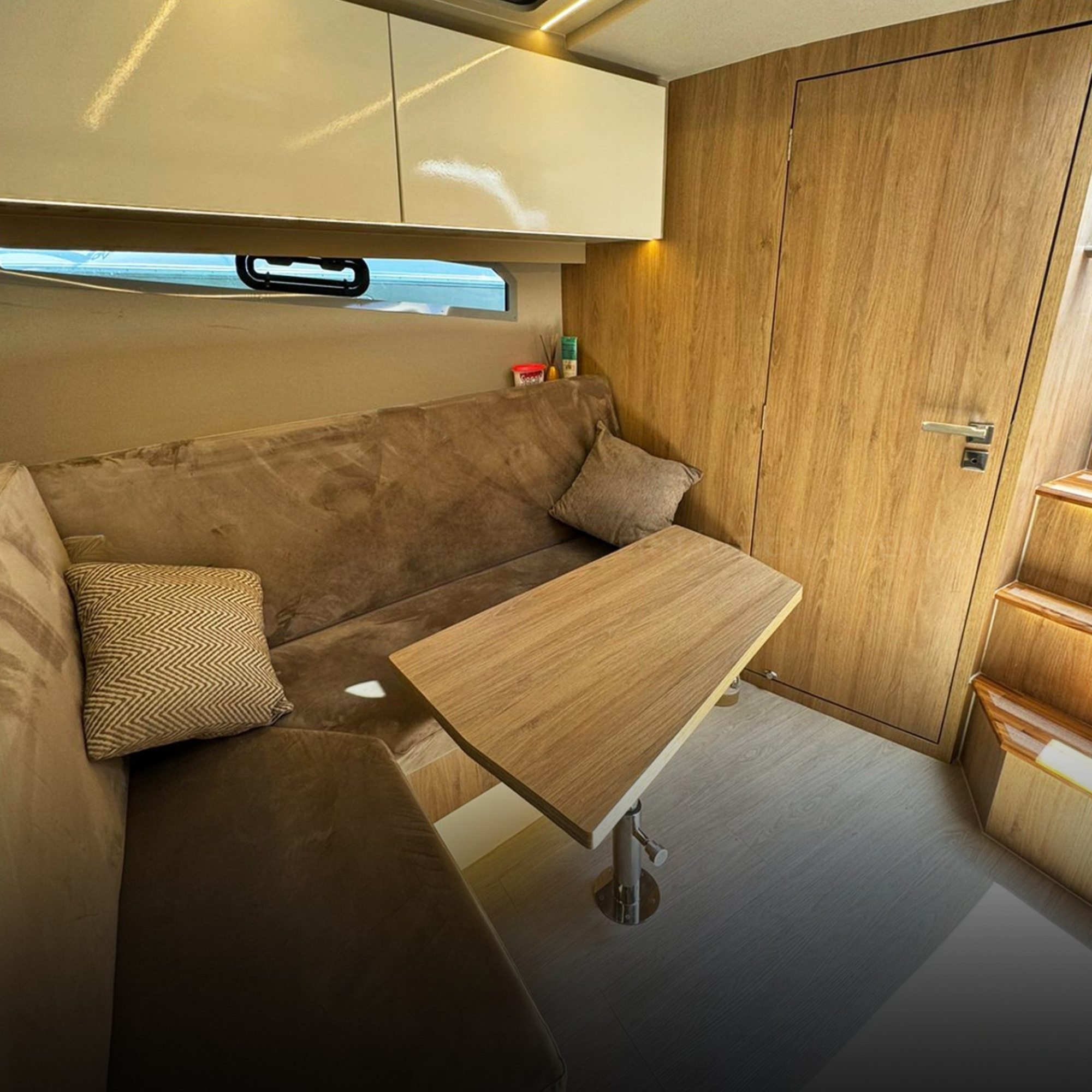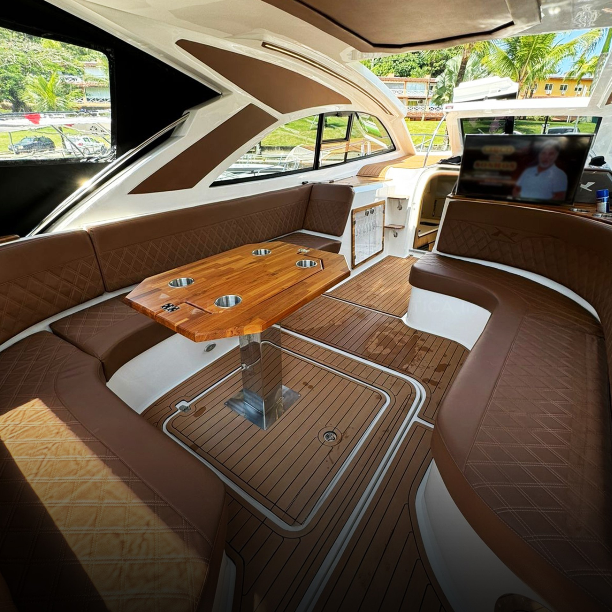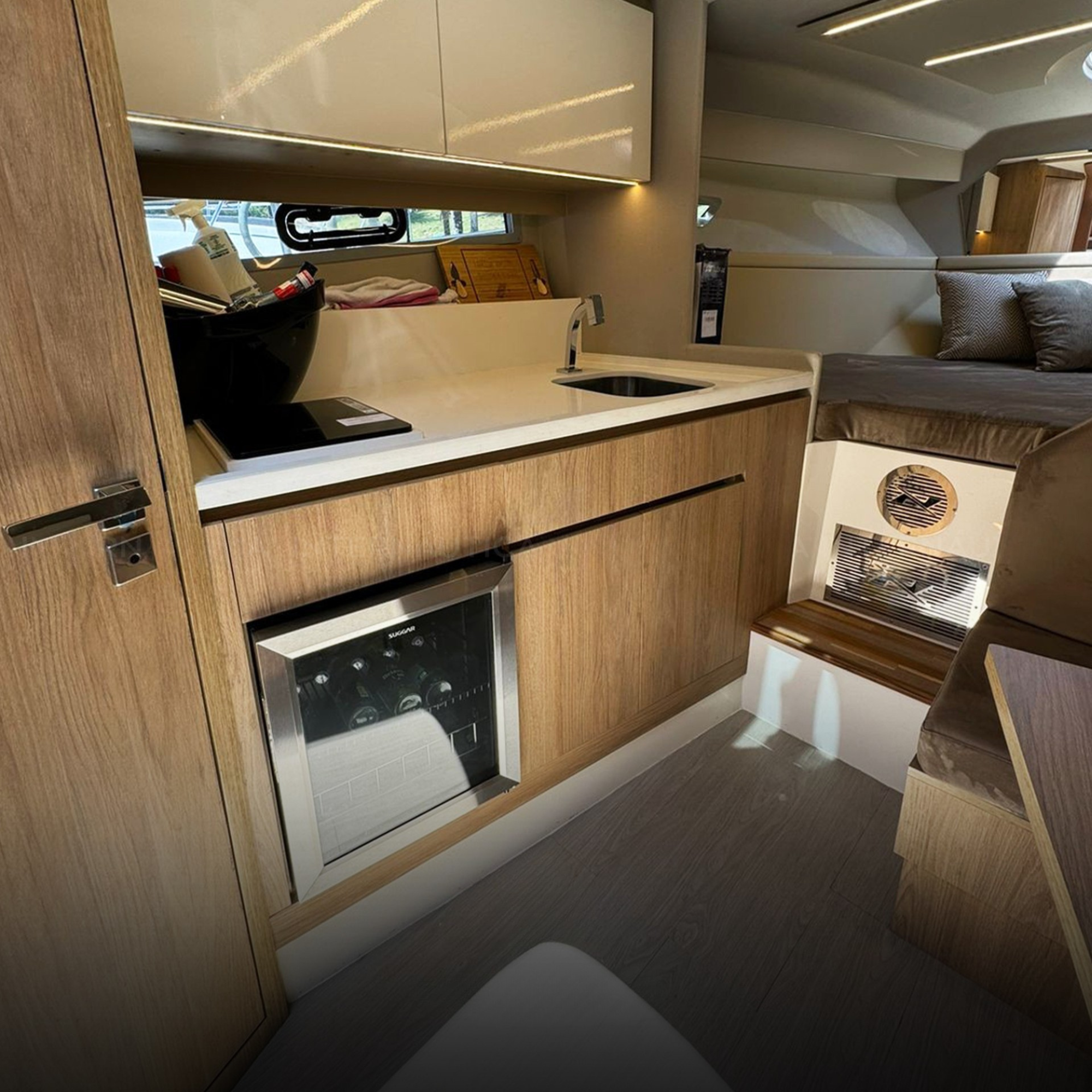 Antena TV, Ar Condicionado, Boiler, Carregador de Baterias, Churrasqueira, Chuveiro de Popa, Cristaleira, Comando Eletrônico, Fogão Elétrico, Geladeira, Geleira, Gerador, GPS, Guincho Elétrico, Inversor, Joystick, Microondas, Rádio VHF, Solário de Popa, Som, Sonda, Strobolight, Targa, Teka Patamar de Popa, Teka Praça de Popa, Teka Cockpit, Televisão, Tomada de Cais, WC Elétrico