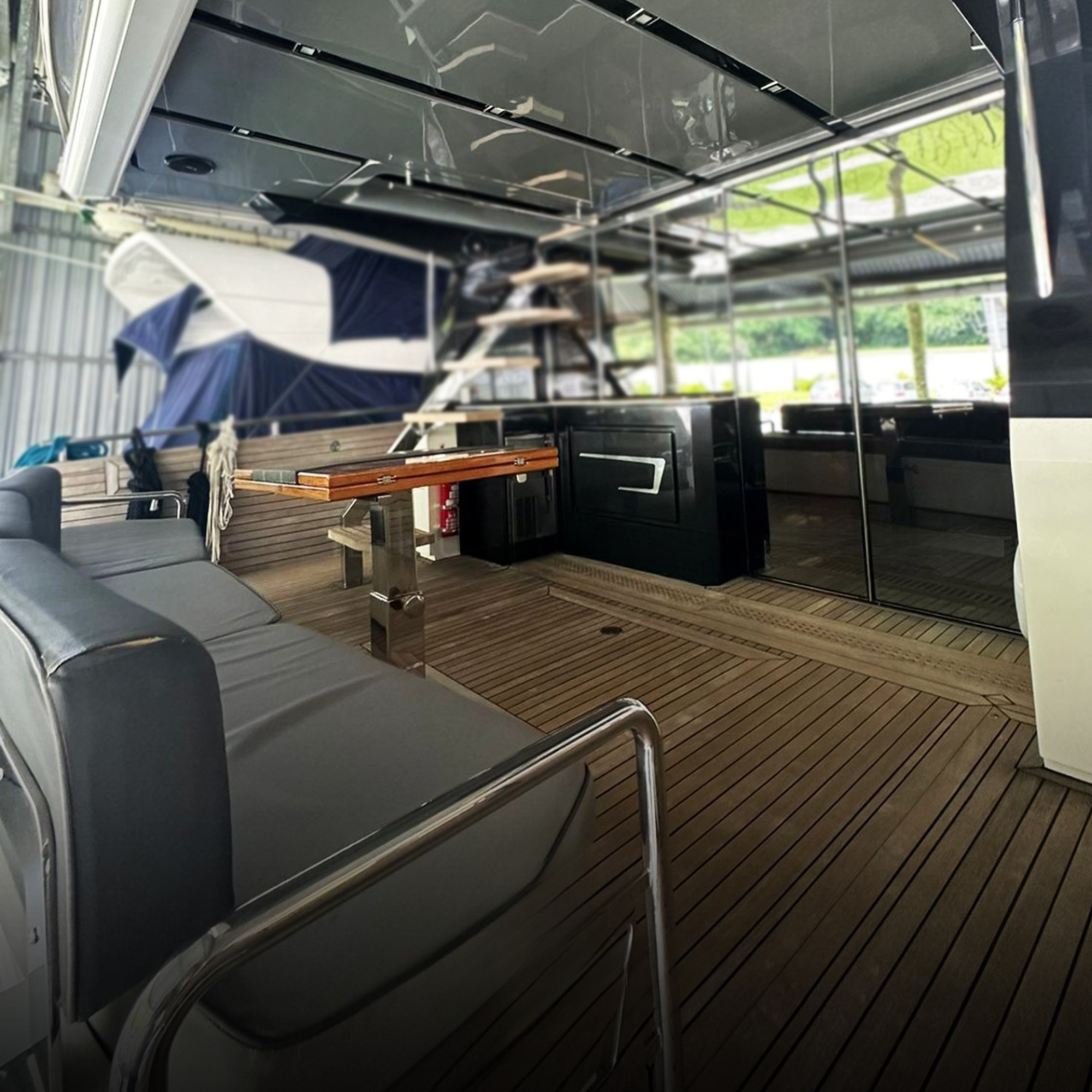 Antena TV, Ar Condicionado, Boiler, Bússola, Capa, Capota, Carregador de Baterias, Churrasqueira, Chuveiro de Popa, Cristaleira, Comando Eletrônico, Direção Hidráulica, Faróis, Farol Robotizado, Flaps Hidráulicos, Fogão Elétrico, Geladeira, Gerador, GPS, GPS Fly, Guincho Elétrico, Iluminação Subaquática, Inversor, Joystick, Piloto Automático, Radar, Rádio VHF, Rádio VHF Fly, SKY, Solário de Popa, Solário de Proa, Som, Tapete Emborrachado, Televisão, Tomada de Cais, WC Elétrico, Extintor