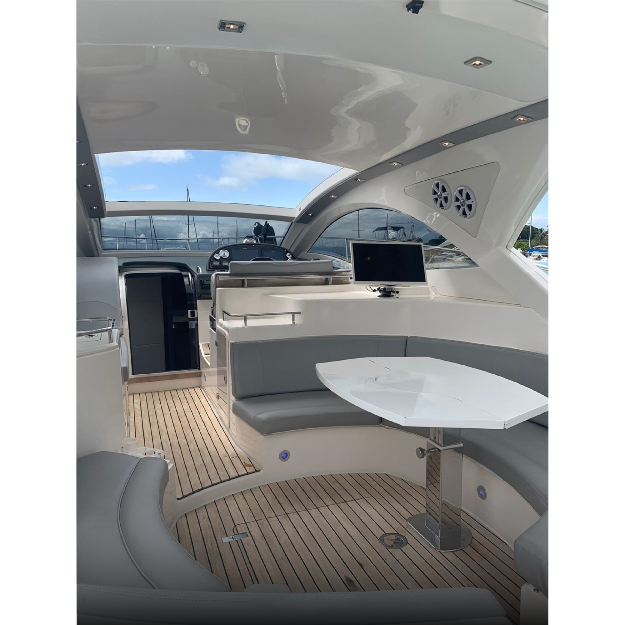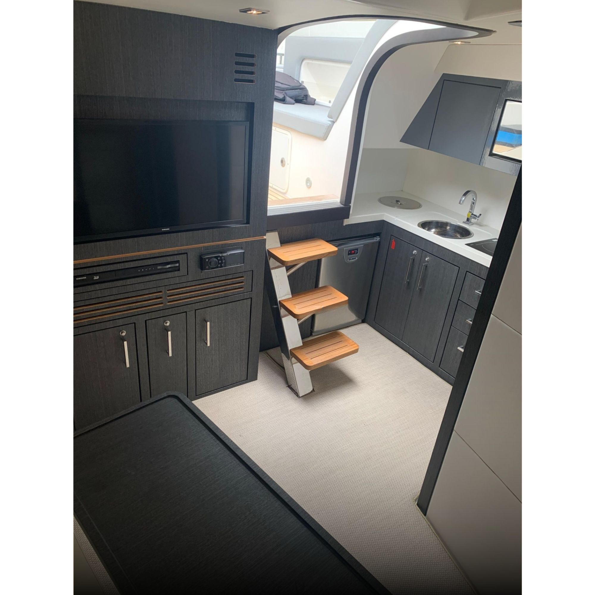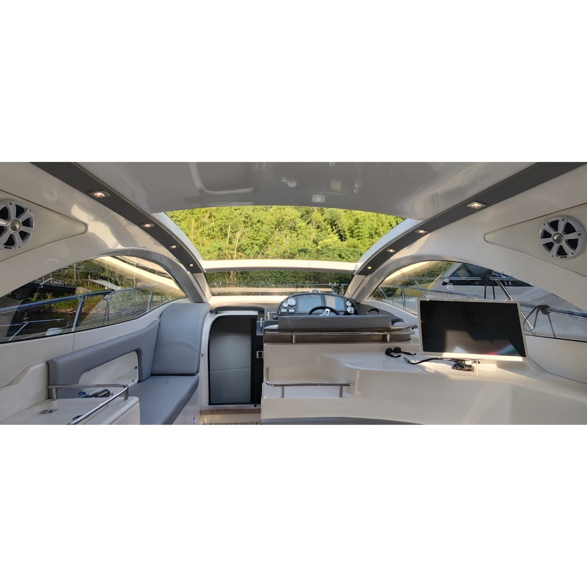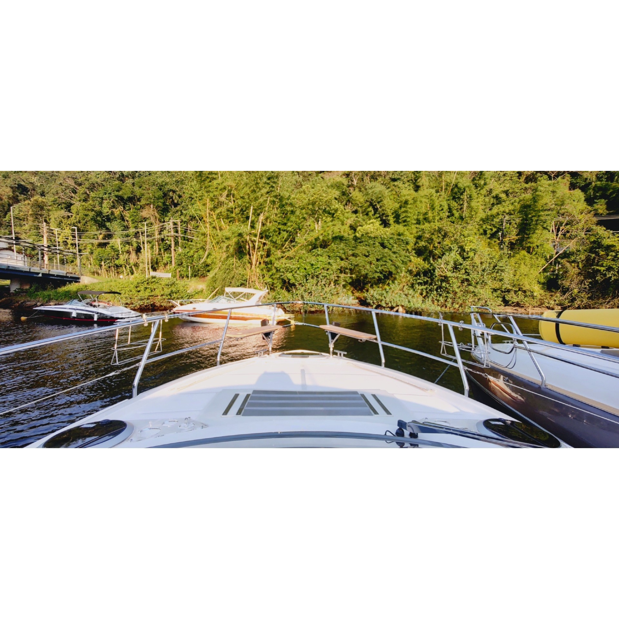 Antena TV, Ar Condicionado, Boiler, Bússola, Carregador de Baterias, Carreta, Churrasqueira, Chuveiro de Popa, Cristaleira, Comando Eletrônico, Farol Robotizado, Fechamento Completo, Flaps Hidráulicos, Fogão Elétrico, Geladeira, Geleira, Gerador, GPS, Guincho Elétrico, Joystick, Rádio VHF, Solário de Proa, Som, Sonda, Teka Praça de Popa, Televisão, Toldo, Tomada de Cais, WC Elétrico, Quartos: 2, Banheiros: 2