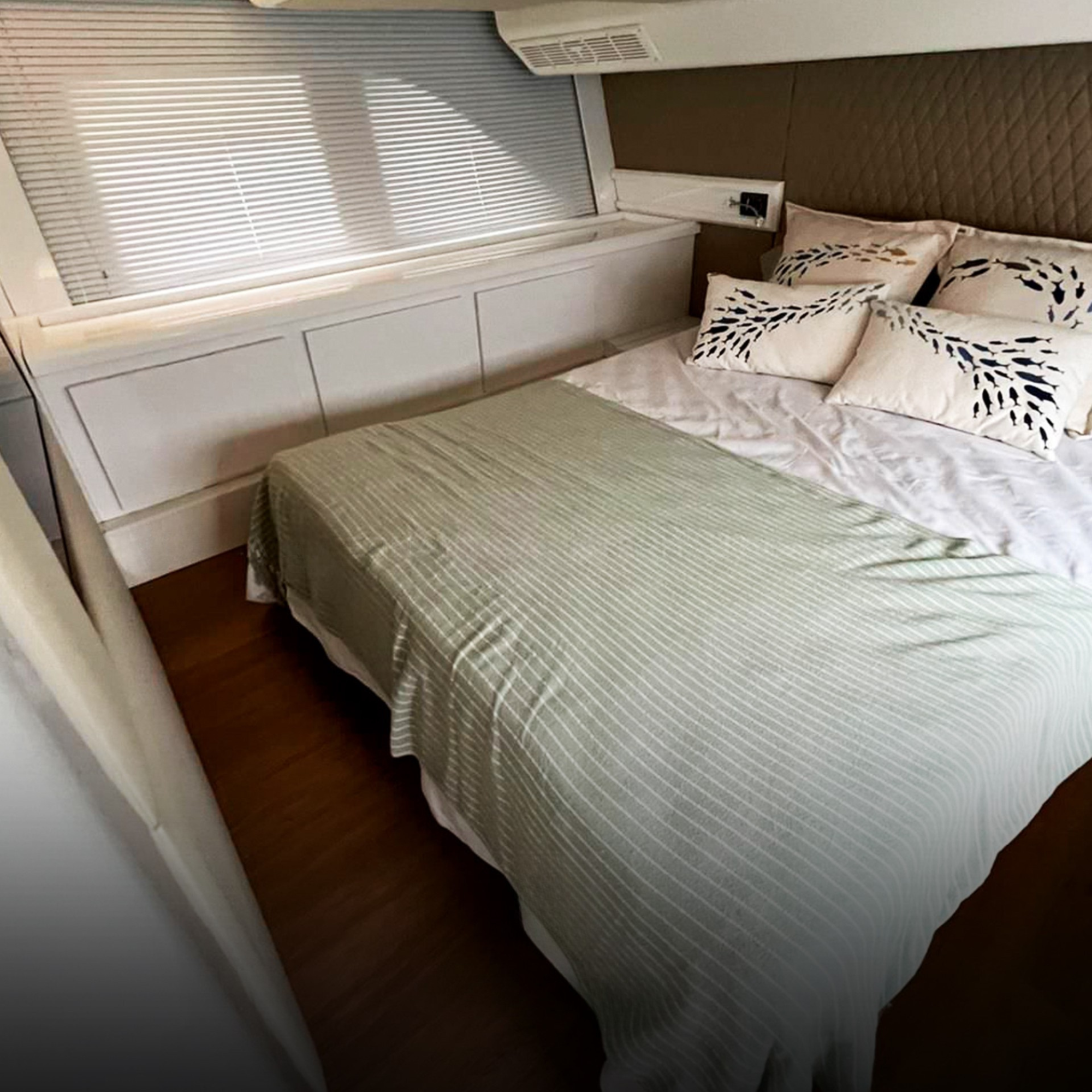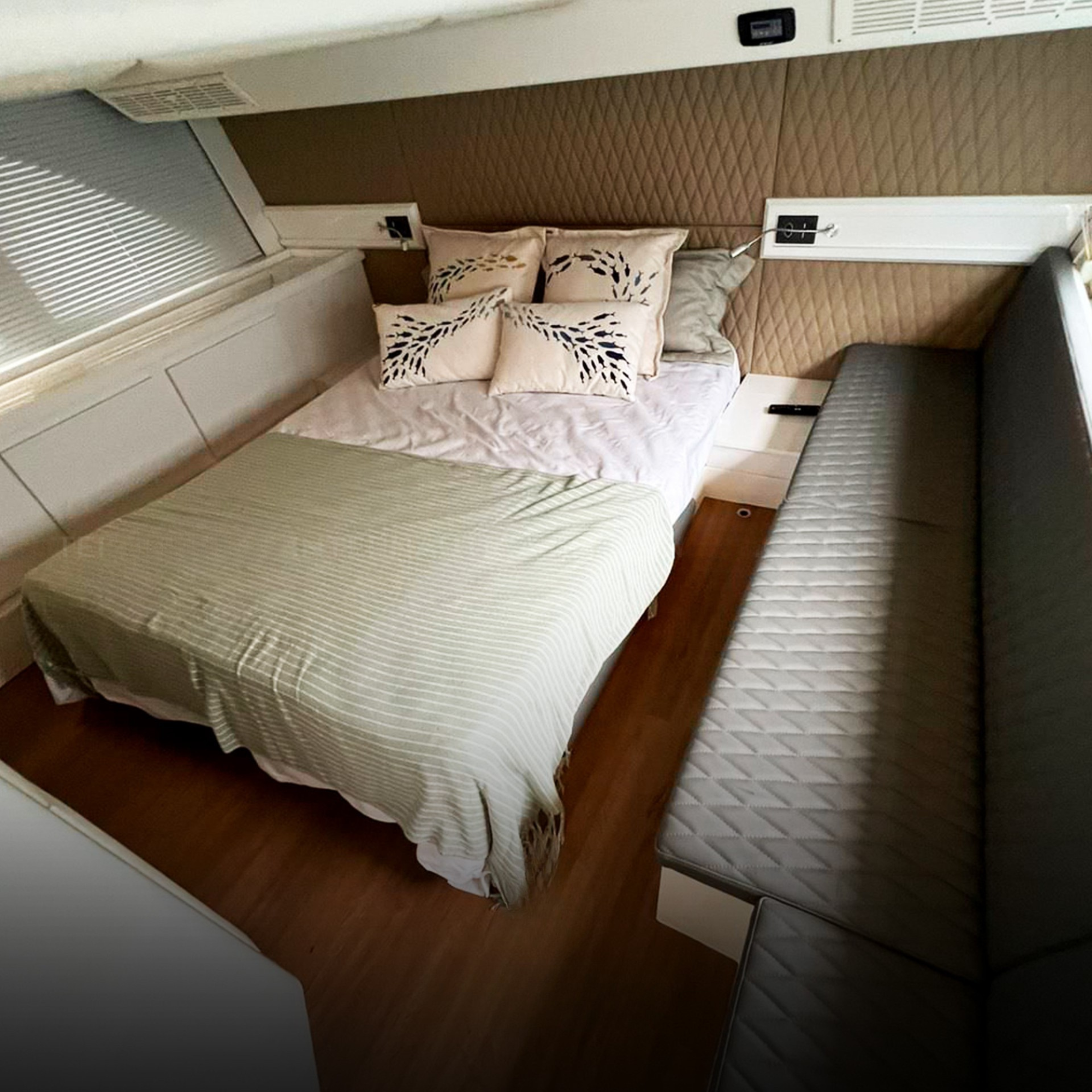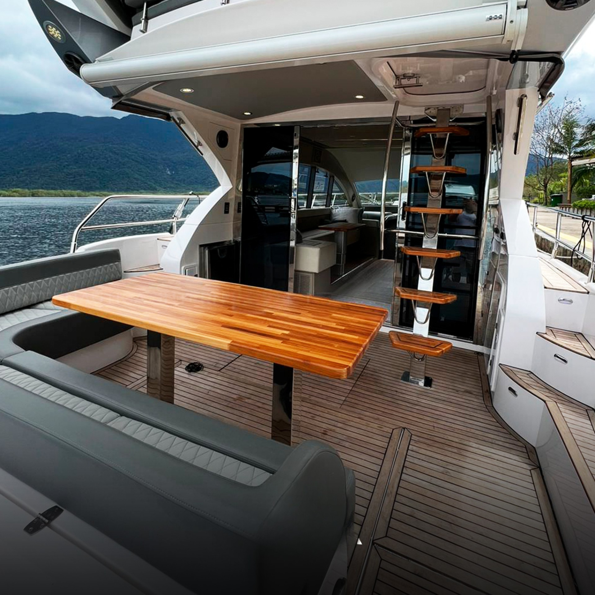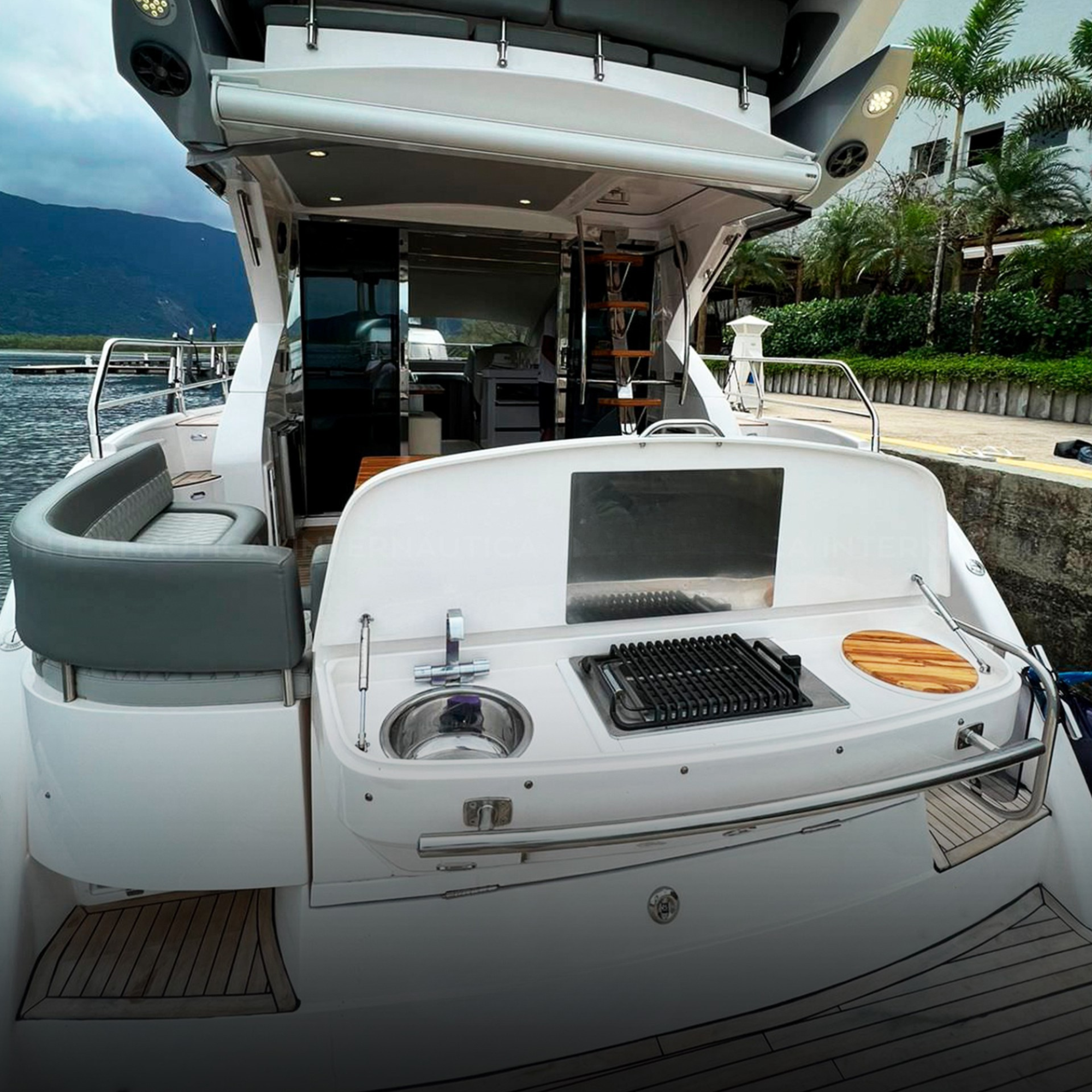 Antena TV, Ar Condicionado, Boiler, Bússola, Capota, Carregador de Baterias, Carreta, Churrasqueira, Chuveiro de Popa, Cristaleira, Comando Eletrônico, Direção Hidráulica, DVD, Fechamento Completo, Flaps Hidráulicos, Fogão Elétrico, Geladeira, Gerador, GPS, GPS Fly, Guincho Elétrico, Inversor, Joystick, Plataforma Submergível, Microondas, Rádio VHF, Rádio VHF Fly, Solário de Proa, Som, Sonda, Strobolight, Teka Patamar de Popa, Teka Praça de Popa, Teka Cockpit, Televisão, Toldo, Tomada de Cais, WC Elétrico